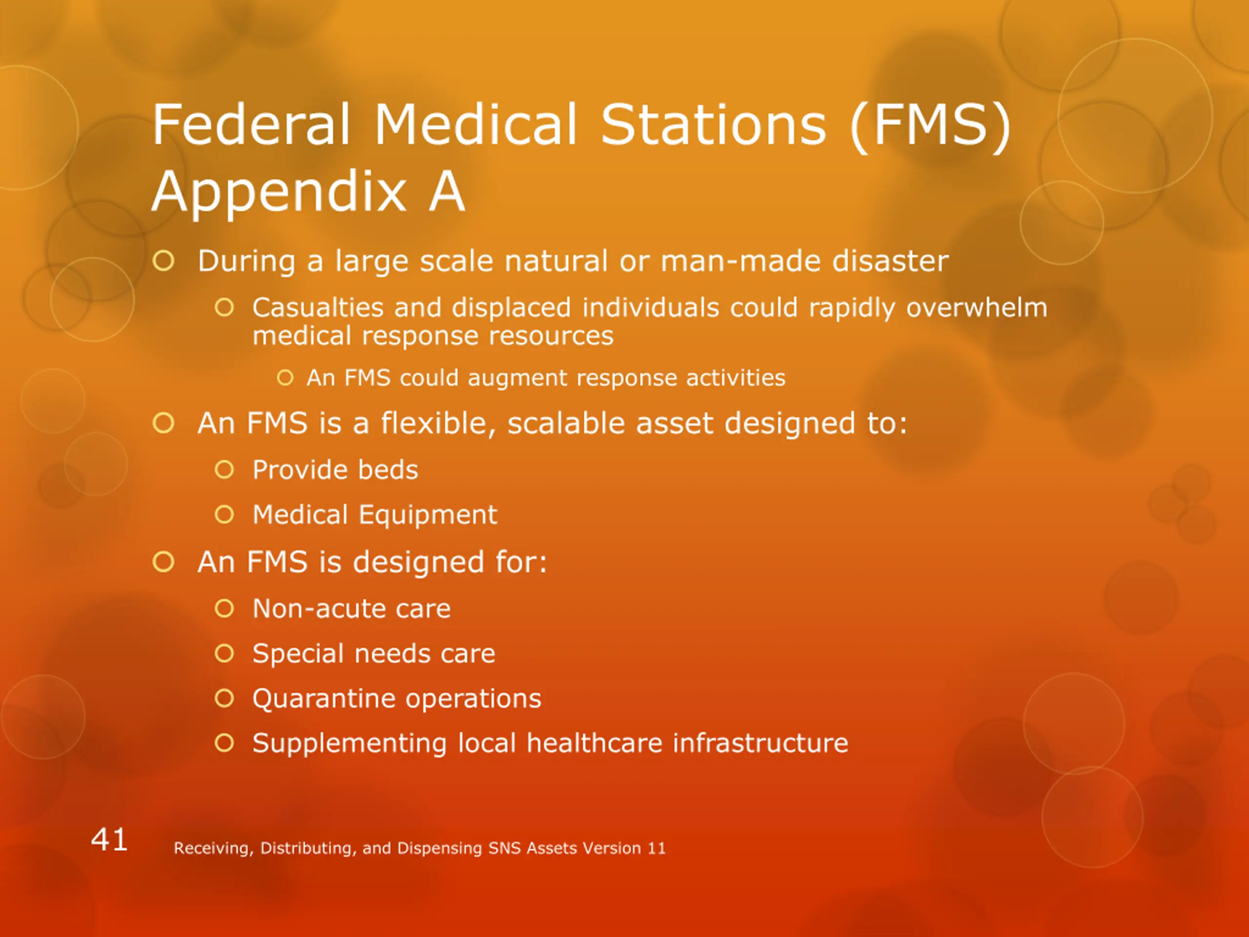 Federal Medical Stations (FMS) Appendix A During a large scale natural or man-made disaster Casualties and displaced individuals could rapidly overwhelm medical response resources An FMS could augment response activities An FMS is a flexible, scalable asset designed to: Provide beds Medical Equipment An FMS is designed for: Non-acute care Special needs care Quarantine operations Supplementing local healthcare infrastructure 41 Receiving, Distributing, and Dispensing SNS Assets Version 11