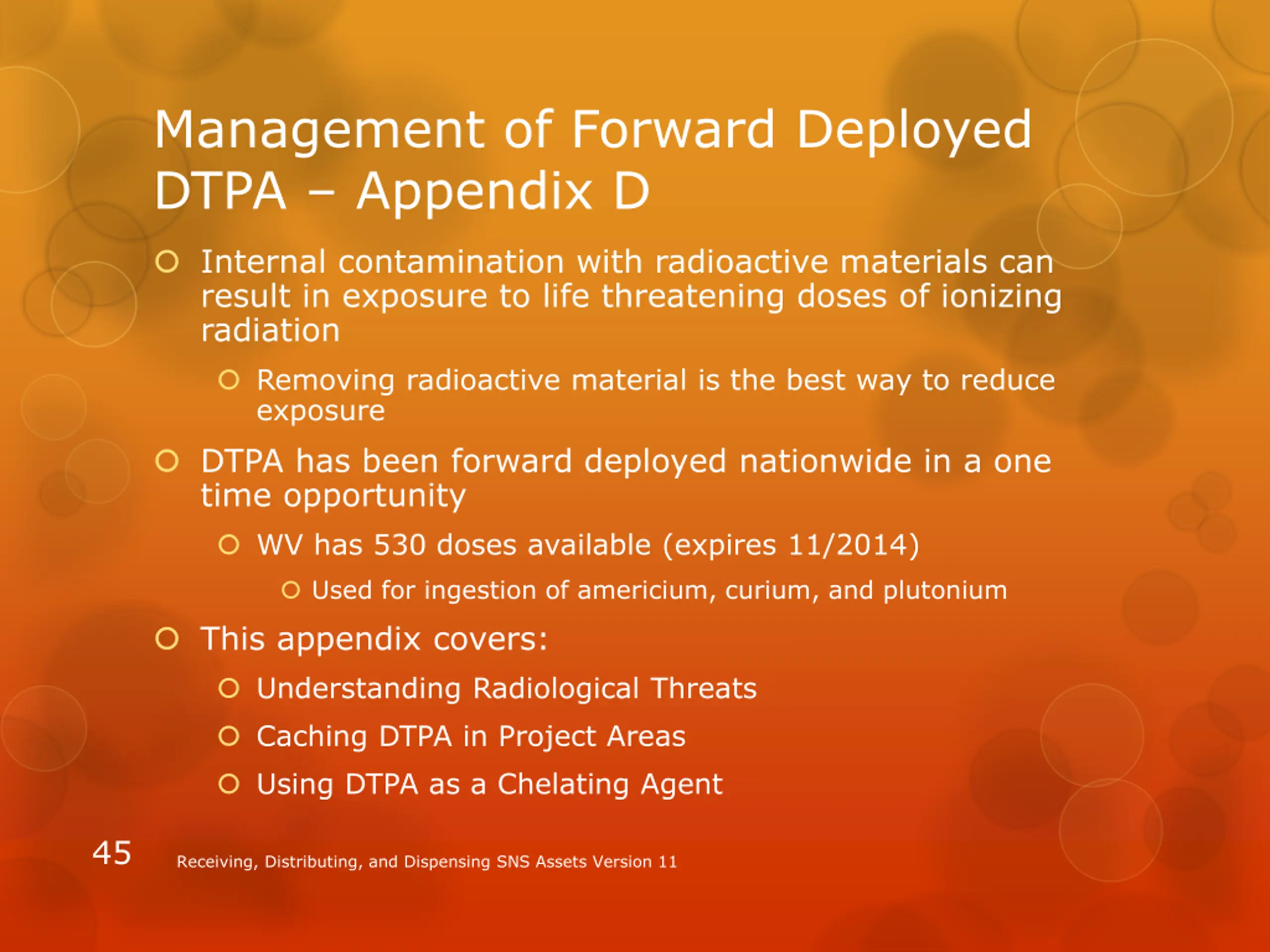 Management of Forward Deployed DTPA Appendix D Internal contamination with radioactive materials can result in exposure to life threatening doses of ionizing radiation Removing radioactive material is the best way to reduce exposure DTPA has been forward deployed nationwide in a one time opportunity WV has 530 doses available (expires 11/2014) Used for ingestion of americium, curium, and plutonium This appendix covers: Understanding Radiological Threats Caching DTPA in Project Areas Using DTPA as a Chelating Agent 45 Receiving, Distributing, and Dispensing SNS Assets Version 11