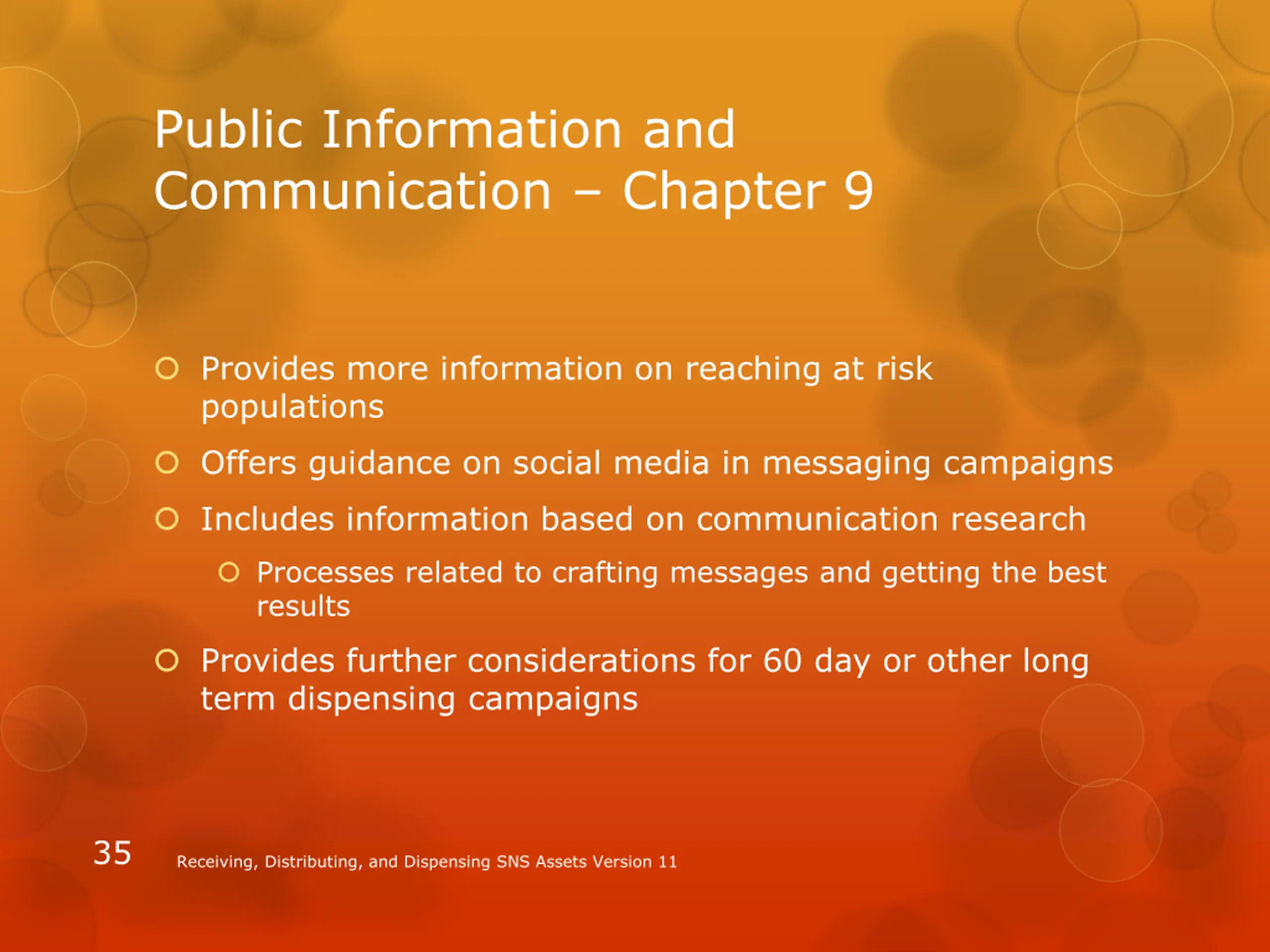 Public Information and Communication Chapter 9 Provides more information on reaching at risk populations Offers guidance on social media in messaging campaigns Includes information based on communication research Processes related to crafting messages and getting the best results Provides further considerations for 60 day or other long term dispensing campaigns 35 Receiving, Distributing, and Dispensing SNS Assets Version 11