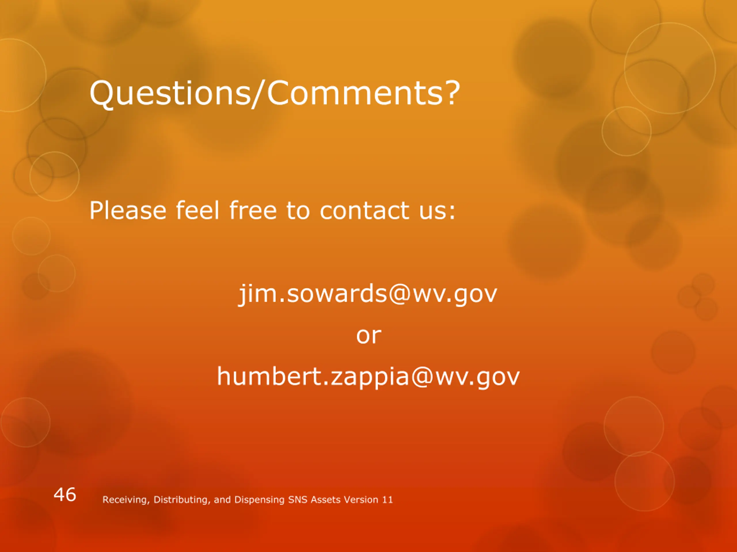 Questions/Comments? Please feel free to contact us: jim.sowards@wv.gov or humbert.zappia@wv.gov 46 Receiving, Distributing, and Dispensing SNS Assets Version 11