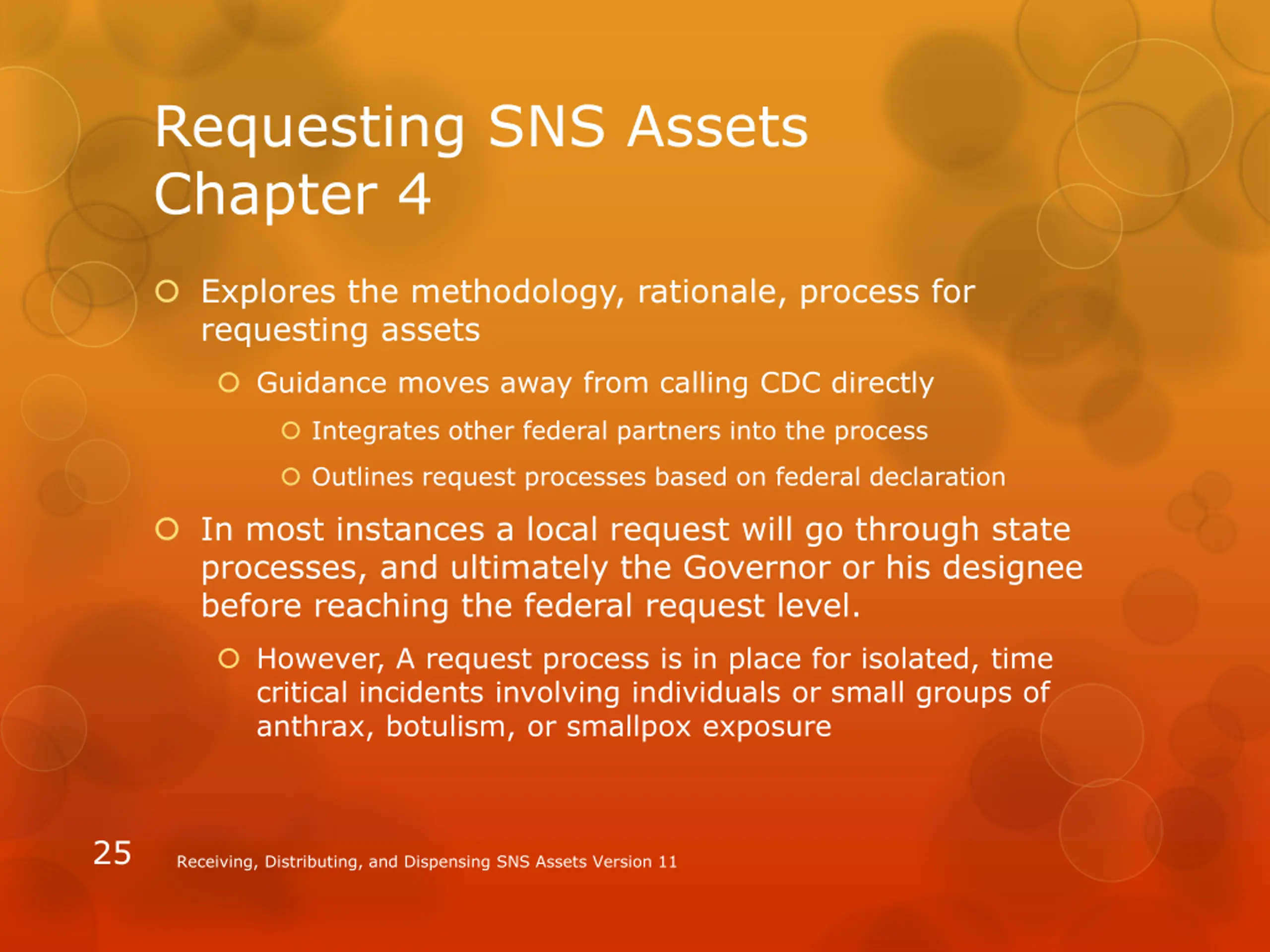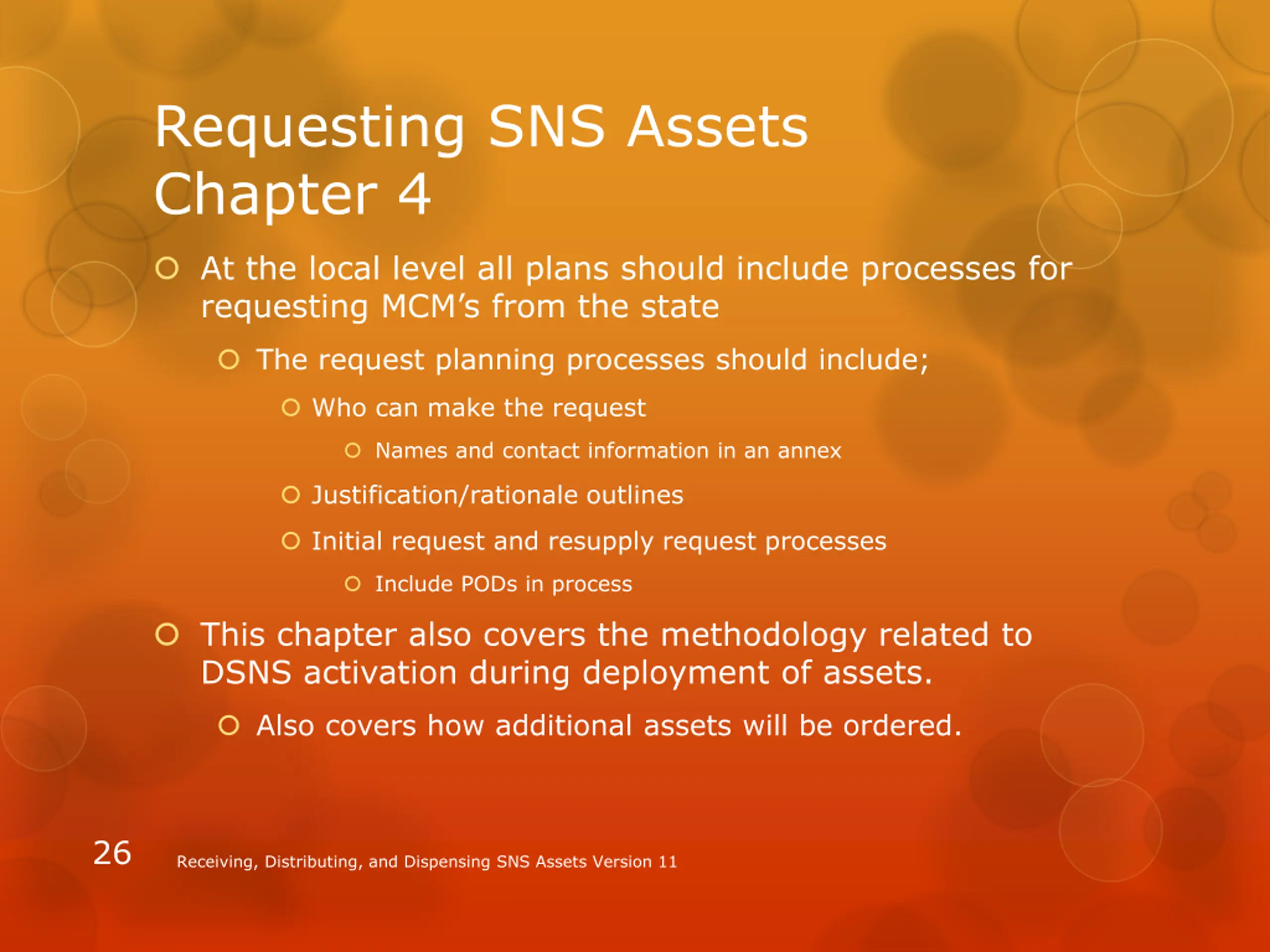 Requesting SNS Assets Chapter 4 At the local level all plans should include processes for requesting MCM s from the state The request planning processes should include; Who can make the request Names and contact information in an annex Justification/rationale outlines Initial request and resupply request processes Include PODs in process This chapter also covers the methodology related to DSNS activation during deployment of assets. Also covers how additional assets will be ordered. 26 Receiving, Distributing, and Dispensing SNS Assets Version 11