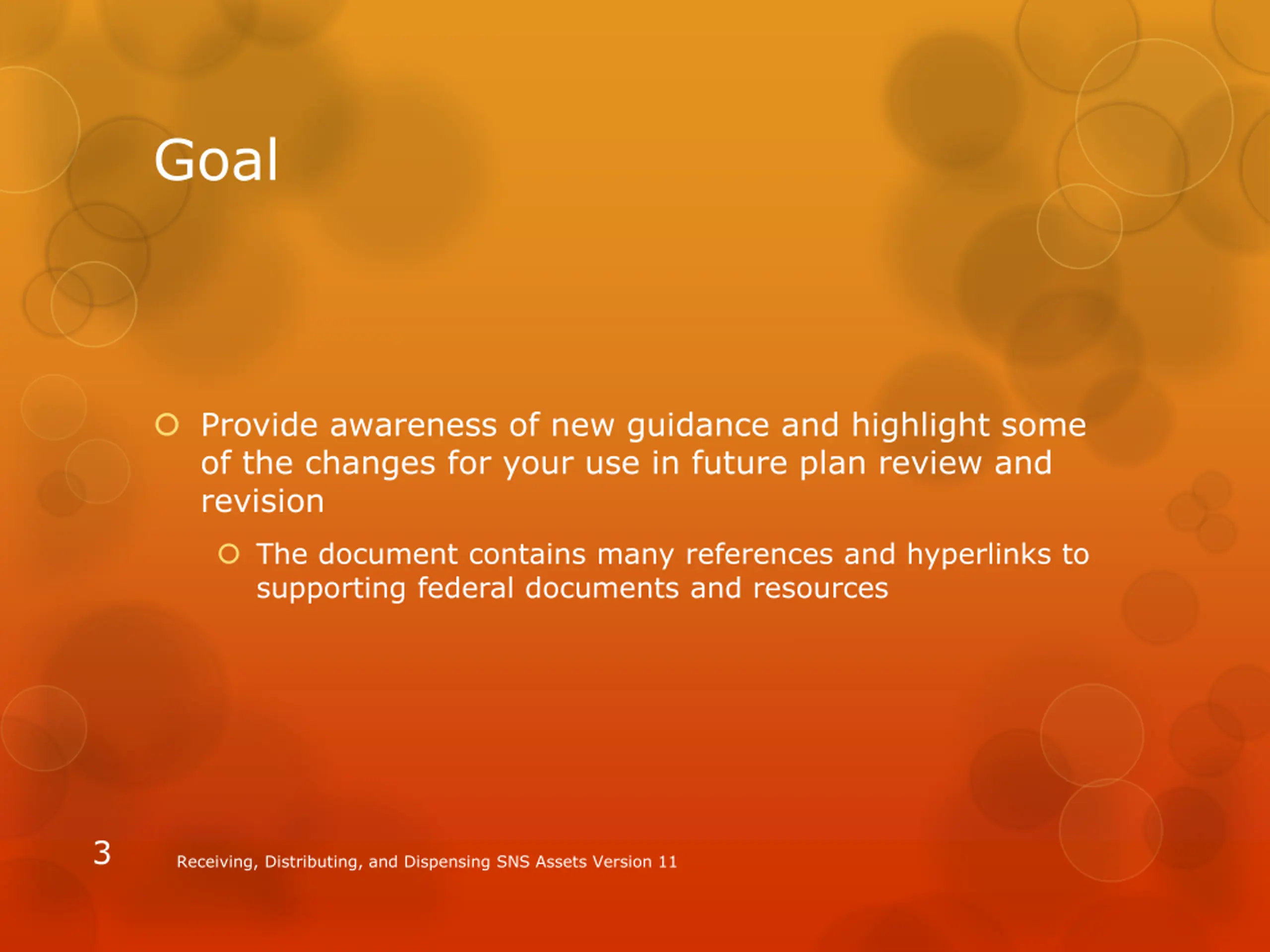 Goal Provide awareness of new guidance and highlight some of the changes for your use in future plan review and revision The document contains many references and hyperlinks to supporting federal documents and resources 3 Receiving, Distributing, and Dispensing SNS Assets Version 11