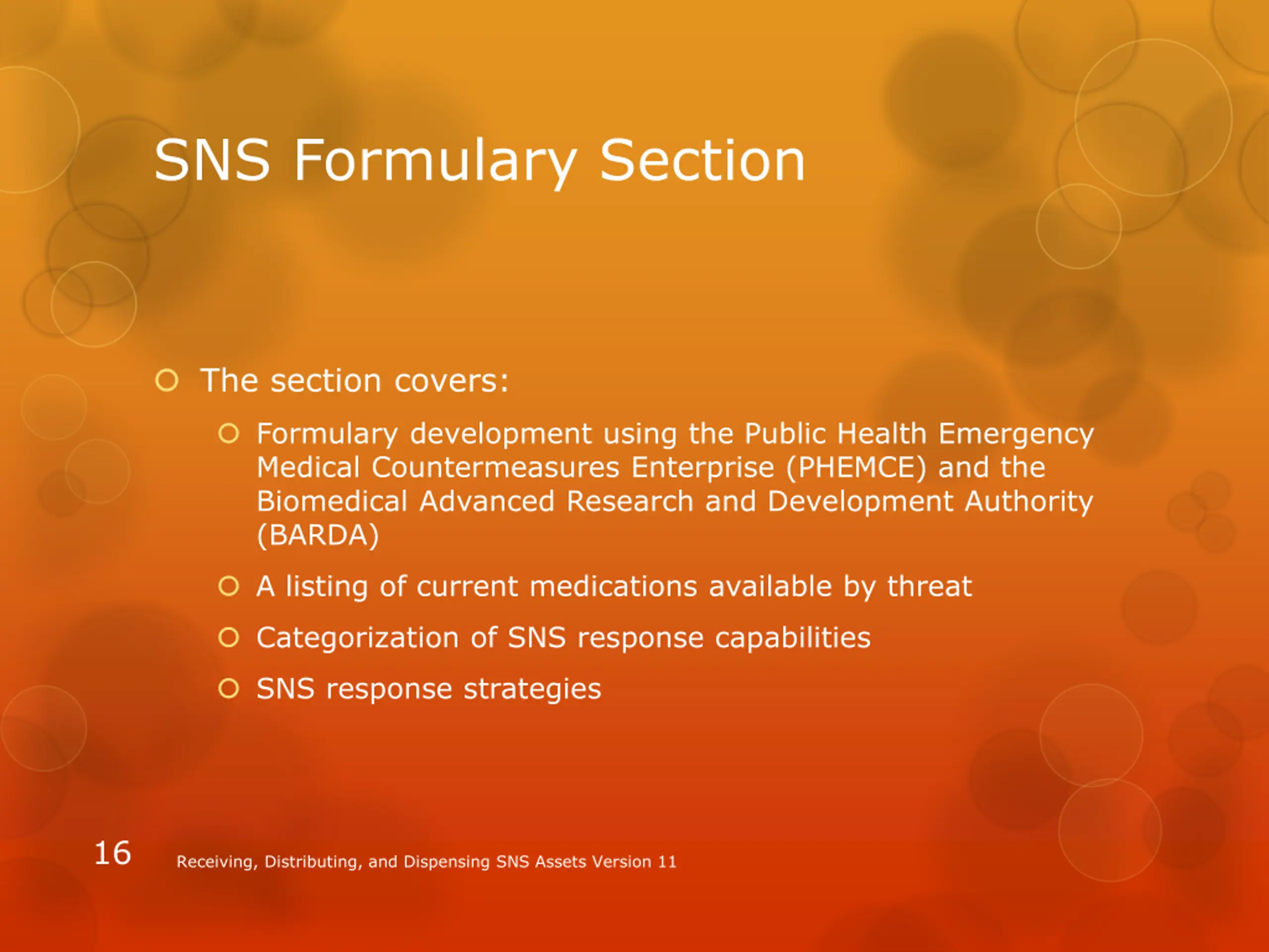 SNS Formulary Section The section covers: Formulary development using the Public Health Emergency Medical Countermeasures Enterprise (PHEMCE) and the Biomedical Advanced Research and Development Authority (BARDA) A listing of current medications available by threat Categorization of SNS response capabilities SNS response strategies 16 Receiving, Distributing, and Dispensing SNS Assets Version 11