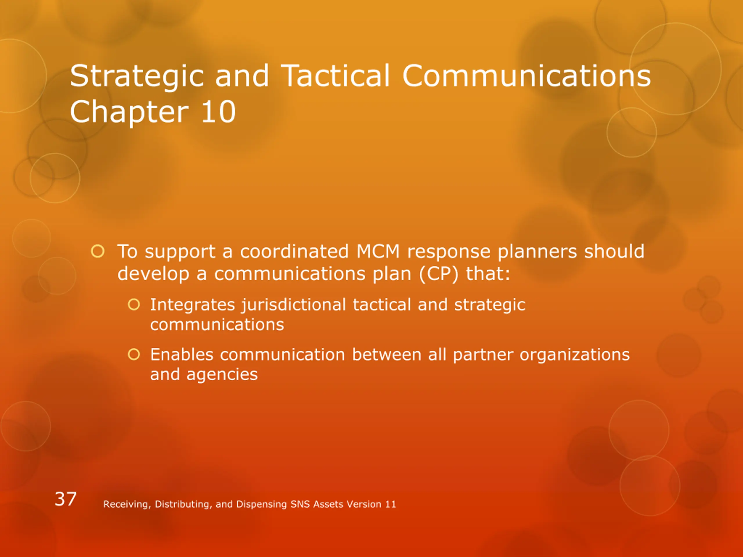 Strategic and Tactical Communications Chapter 10 To support a coordinated MCM response planners should develop a communications plan (CP) that: Integrates jurisdictional tactical and strategic communications Enables communication between all partner organizations and agencies 37 Receiving, Distributing, and Dispensing SNS Assets Version 11