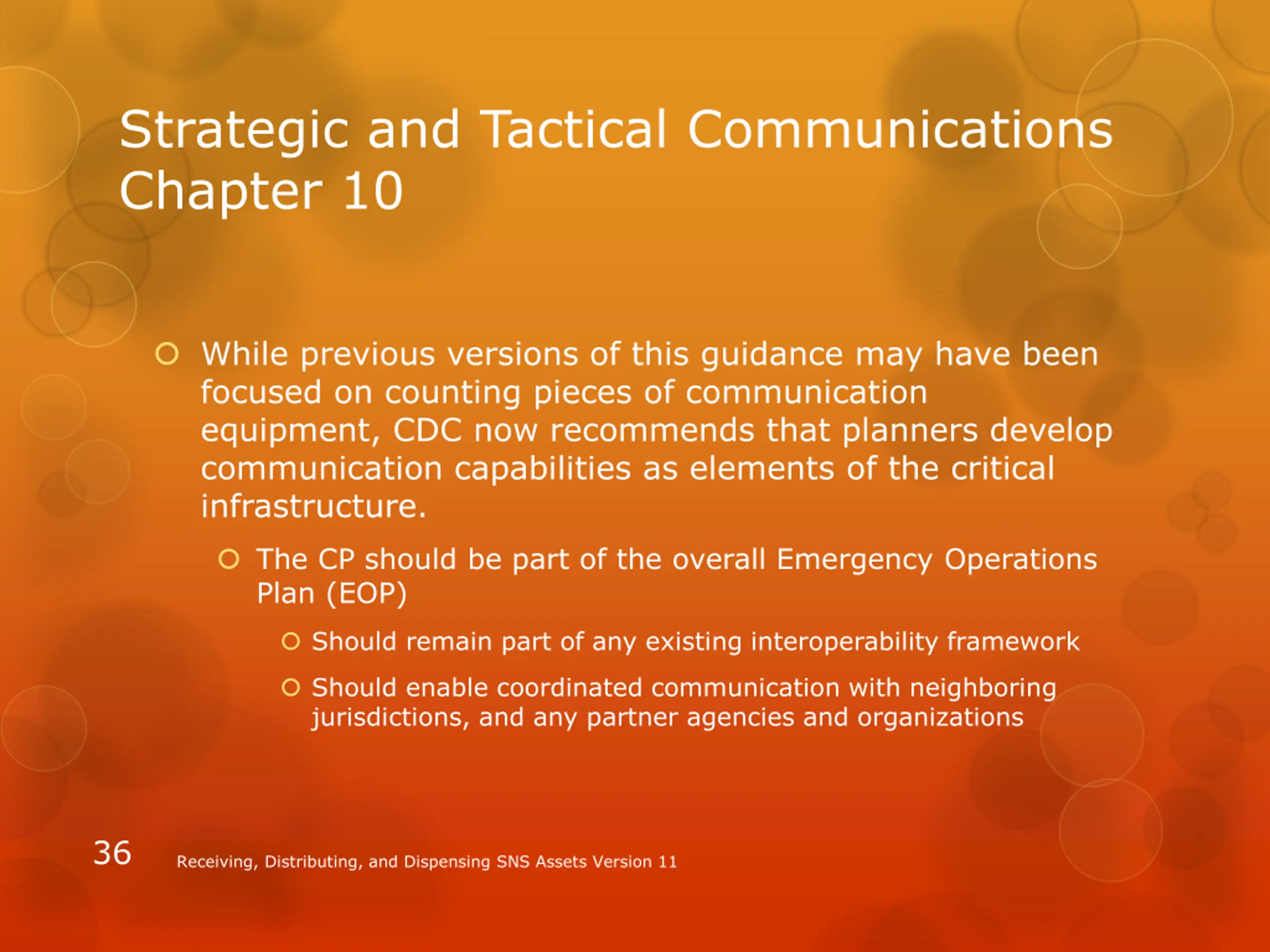 Strategic and Tactical Communications Chapter 10 While previous versions of this guidance may have been focused on counting pieces of communication equipment, CDC now recommends that planners develop communication capabilities as elements of the critical infrastructure. The CP should be part of the overall Emergency Operations Plan (EOP) Should remain part of any existing interoperability framework Should enable coordinated communication with neighboring jurisdictions, and any partner agencies and organizations 36 Receiving, Distributing, and Dispensing SNS Assets Version 11