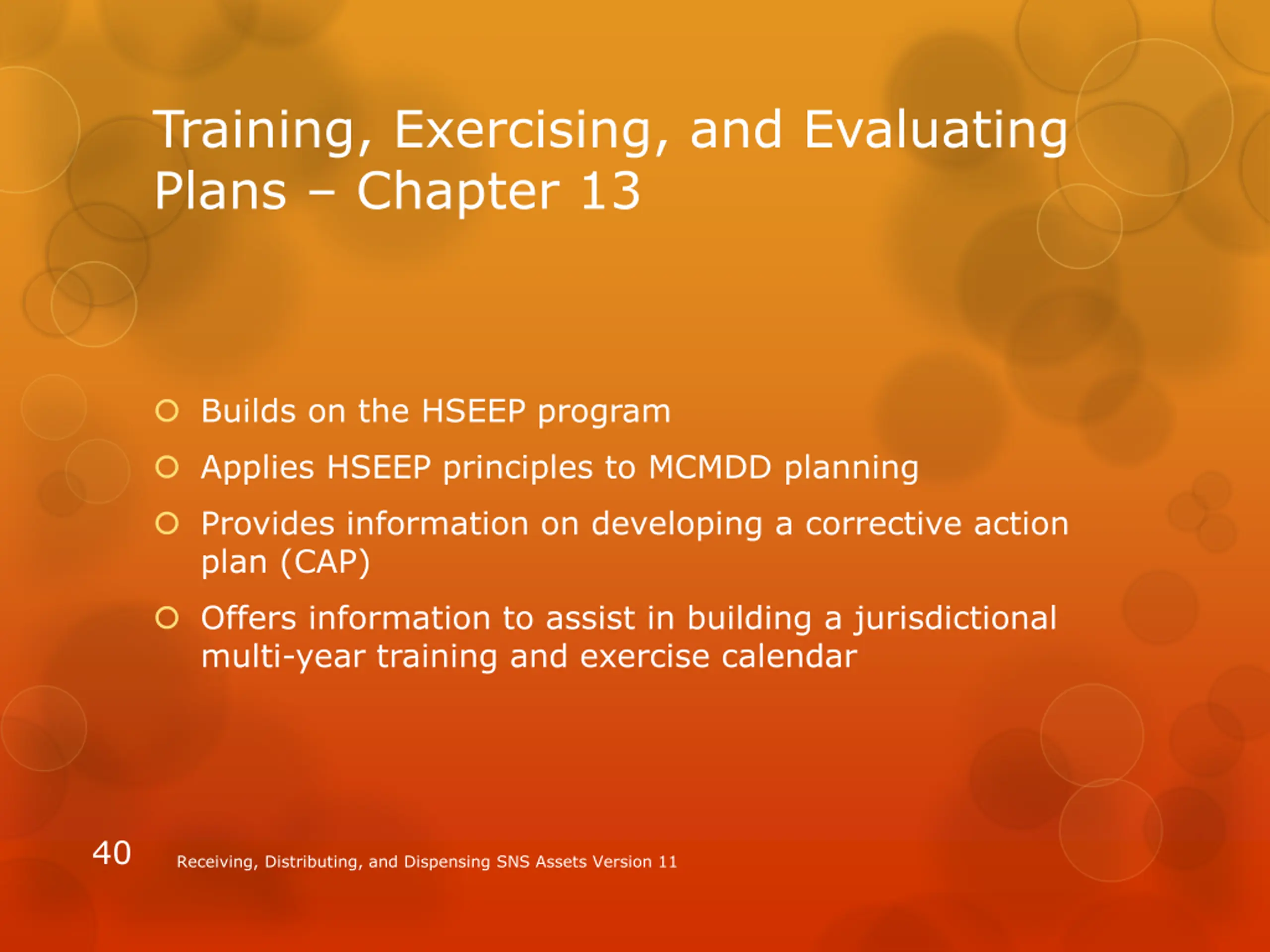 Training, Exercising, and Evaluating Plans Chapter 13 Builds on the HSEEP program Applies HSEEP principles to MCMDD planning Provides information on developing a corrective action plan (CAP) Offers information to assist in building a jurisdictional multi-year training and exercise calendar 40 Receiving, Distributing, and Dispensing SNS Assets Version 11