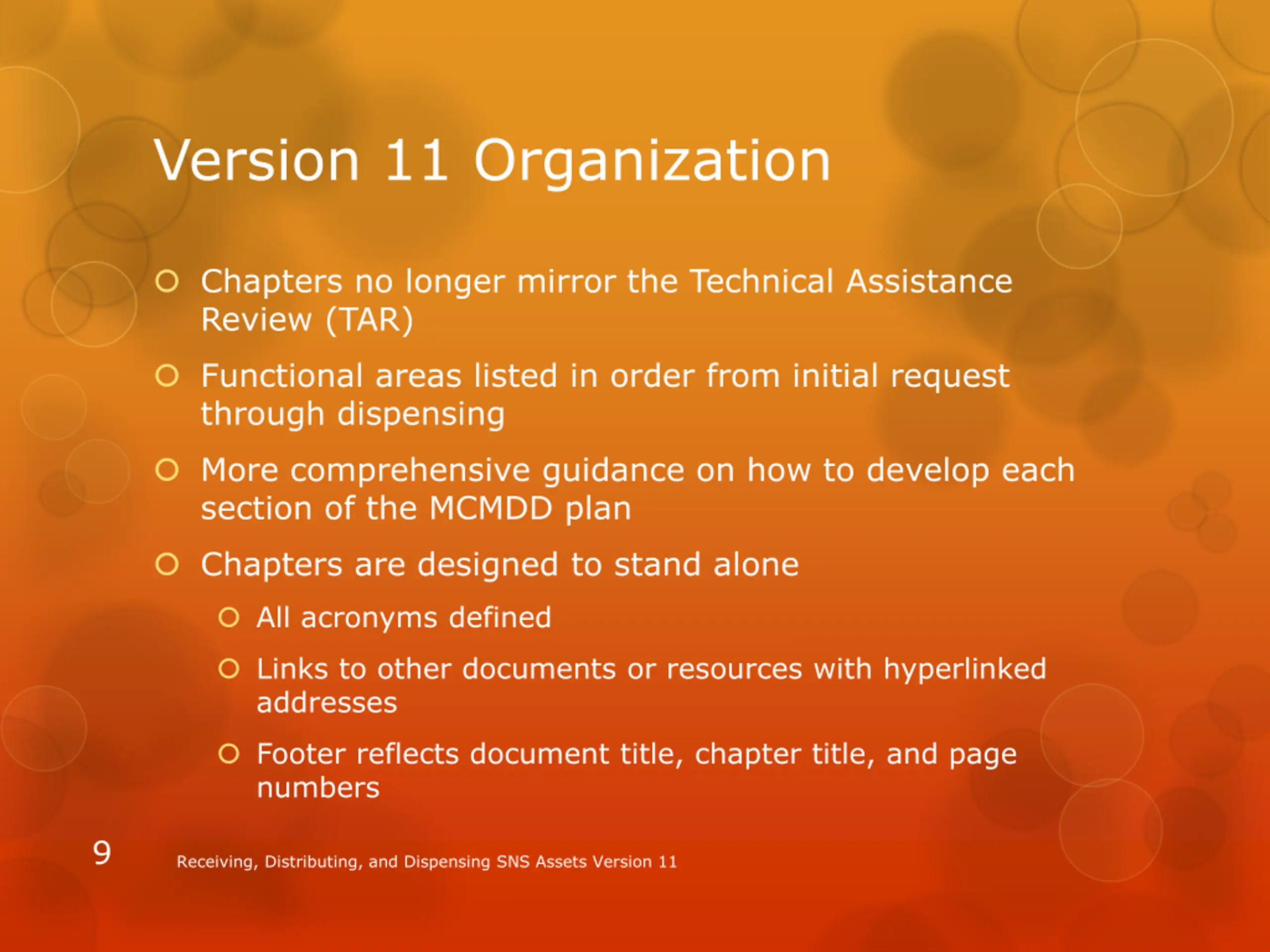 Version 11 Organization Chapters no longer mirror the Technical Assistance Review (TAR) Functional areas listed in order from initial request through dispensing More comprehensive guidance on how to develop each section of the MCMDD plan Chapters are designed to stand alone All acronyms defined Links to other documents or resources with hyperlinked addresses Footer reflects document title, chapter title, and page numbers 9 Receiving, Distributing, and Dispensing SNS Assets Version 11