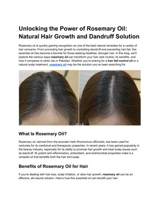 For those who prefer a more natural approach, rosemary oil may be just as effective as some of the leading hair loss treatments without the harsh chemicals. Its wide range of benefits, from improving circulation to strengthening hair strands, makes it a versatile option for anyone looking to enhance their hair care routine. Conclusion Rosemary oil is quickly becoming a staple in hair care routines around the world, and for good reason. Its ability to stimulate hair growth, prevent hair loss, and improve scalp health makes it a powerful ally in the fight against hair thinning and damage. Whether you're struggling with hair loss or simply want to give your hair a natural boost, rosemary oil is a safe, effective, and natural solution. By incorporating rosemary oil into your routine through scalp massages, hair masks, or even just adding it to your shampoo, you can enjoy healthier, stronger, and more resilient hair. With its wide range of benefits and minimal side effects, rosemary oil stands out as a natural remedy that promotes hair growth while nourishing both the scalp and hair. In conclusion, adding rosemary oil to your hair care routine is a smart choice for anyone looking to enhance their hair s vitality and appearance. Its natural properties make it an excellent alternative to chemical treatments, providing an effective way to nourish and protect your hair from root to tip.