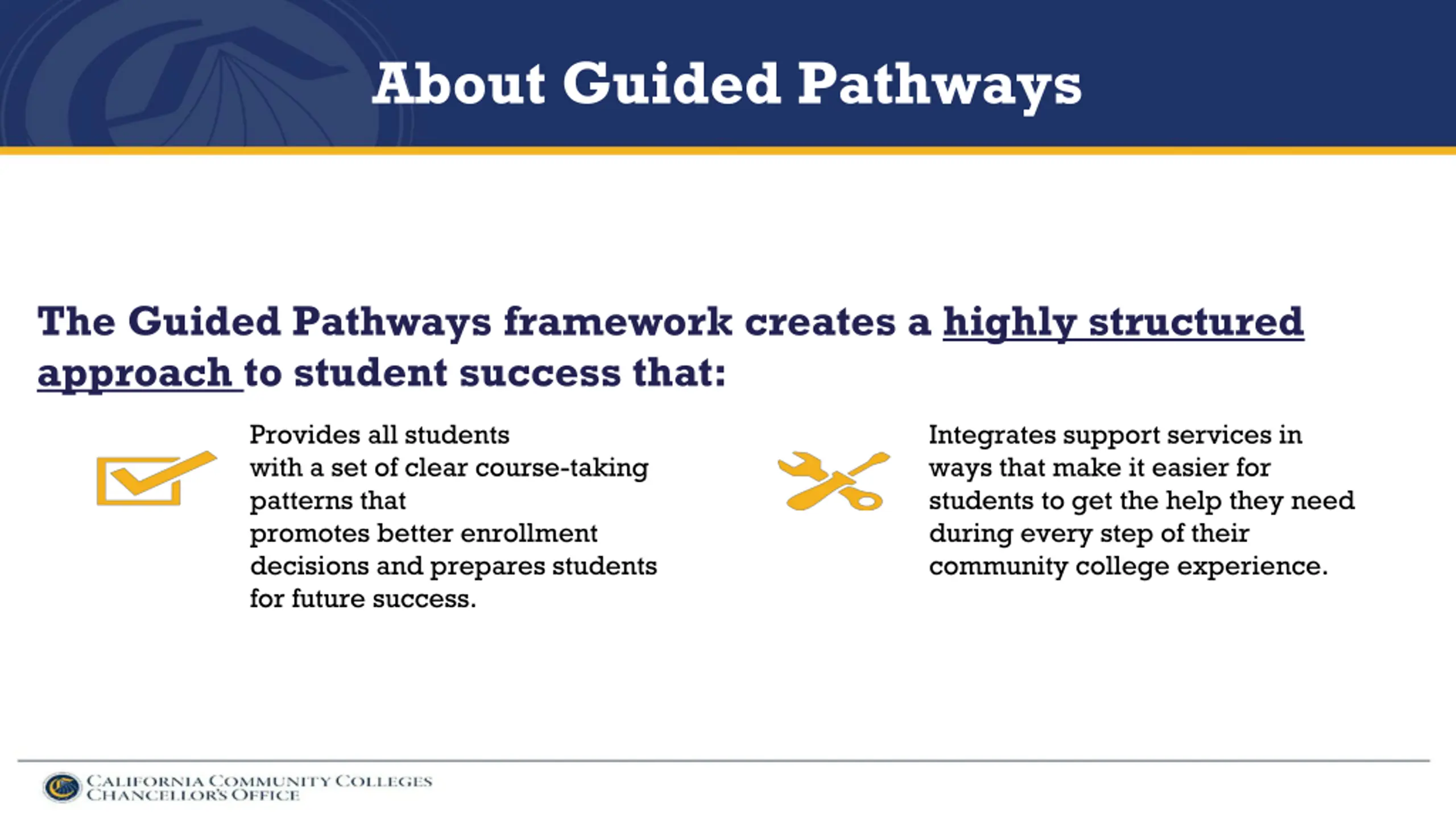 About Guided Pathways The Guided Pathways framework creates a highly structured approach to student success that: Provides all students with a set of clear course-taking patterns that promotes better enrollment decisions and prepares students for future success. Integrates support services in ways that make it easier for students to get the help they need during every step of their community college experience.