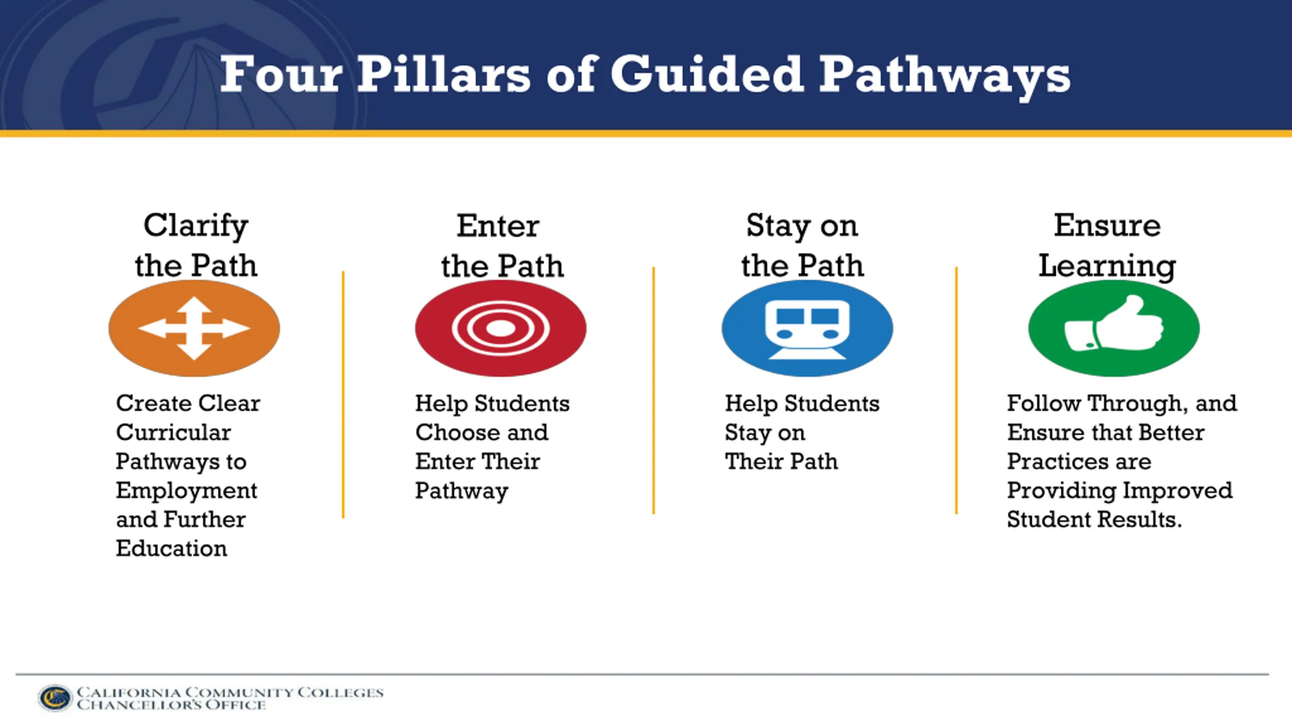 Four Pillars of Guided Pathways Clarify the Path Ensure Learning Stay on the Path Enter the Path Create Clear Curricular Pathways to Employment and Further Education Follow Through, and Ensure that Better Practices are Providing Improved Student Results. Help Students Choose and Enter Their Pathway Help Students Stay on Their Path