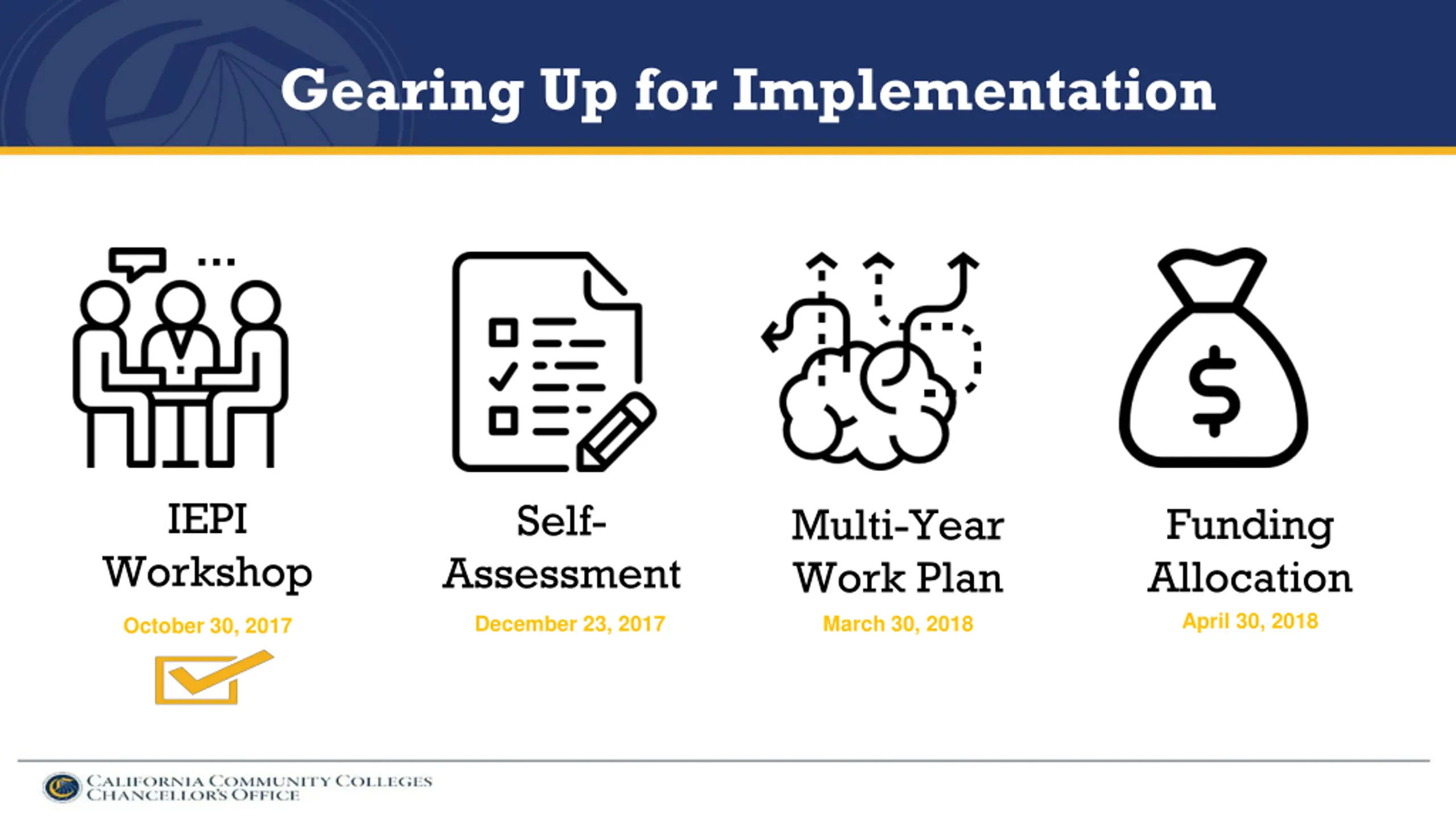 Gearing Up for Implementation IEPI Self- Funding Allocation April 30, 2018 Multi-Year Work Plan March 30, 2018 Workshop Assessment December 23, 2017 October 30, 2017