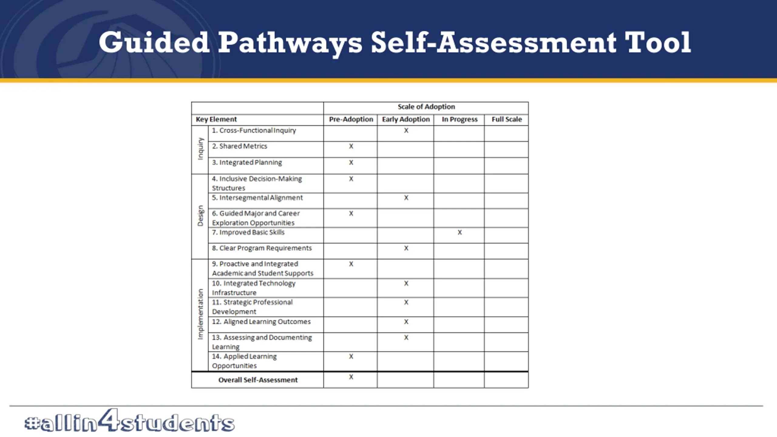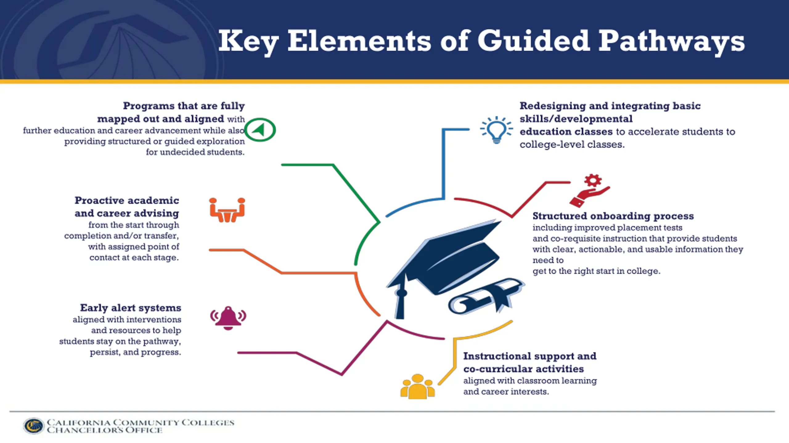Key Elements of Guided Pathways Programs that are fully mapped out and aligned with further education and career advancement while also providing structured or guided exploration Redesigning and integrating basic skills/developmental education classes to accelerate students to college-level classes. for undecided students. Proactive academic and career advising from the start through completion and/or transfer, with assigned point of contact at each stage. Structured onboarding process including improved placement tests and co-requisite instruction that provide students with clear, actionable, and usable information they need to get to the right start in college. Early alert systems aligned with interventions and resources to help students stay on the pathway, persist, and progress. Instructional support and co-curricular activities aligned with classroom learning and career interests.
