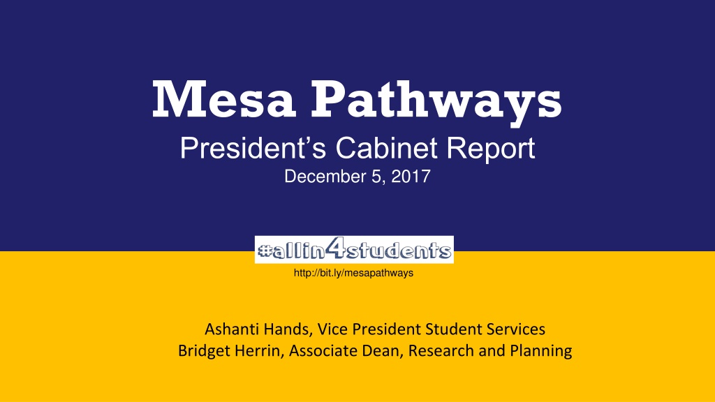 Mesa Pathways President s Cabinet Report December 5, 2017 http://bit.ly/mesapathways Ashanti Hands, Vice President Student Services Bridget Herrin, Associate Dean, Research and Planning