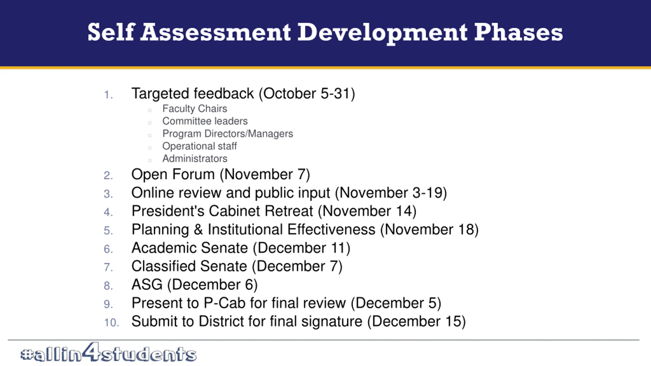 Self Assessment Development Phases Targeted feedback (October 5-31) Faculty Chairs Committee leaders Program Directors/Managers Operational staff Administrators Open Forum (November 7) Online review and public input (November 3-19) President's Cabinet Retreat (November 14) Planning & Institutional Effectiveness (November 18) Academic Senate (December 11) Classified Senate (December 7) ASG (December 6) Present to P-Cab for final review (December 5) 10. Submit to District for final signature (December 15) 1. o o o o o 2. 3. 4. 5. 6. 7. 8. 9.