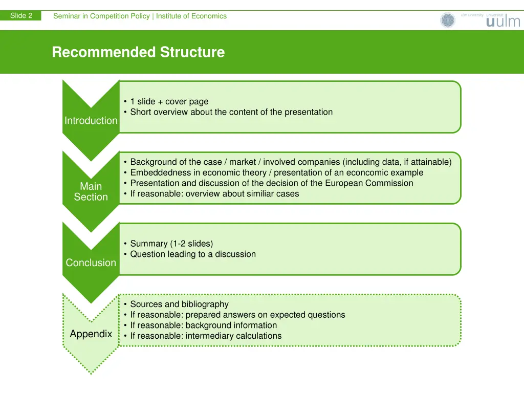 Slide 2 Seminar in Competition Policy | Institute of Economics Recommended Structure 1 slide + cover page Short overview about the content of the presentation Introduction Background of the case / market / involved companies (including data, if attainable) Embeddedness in economic theory / presentation of an econcomic example Presentation and discussion of the decision of the European Commission If reasonable: overview about similiar cases Main Section Summary (1-2 slides) Question leading to a discussion Conclusion Sources and bibliography If reasonable: prepared answers on expected questions If reasonable: background information If reasonable: intermediary calculations Appendix