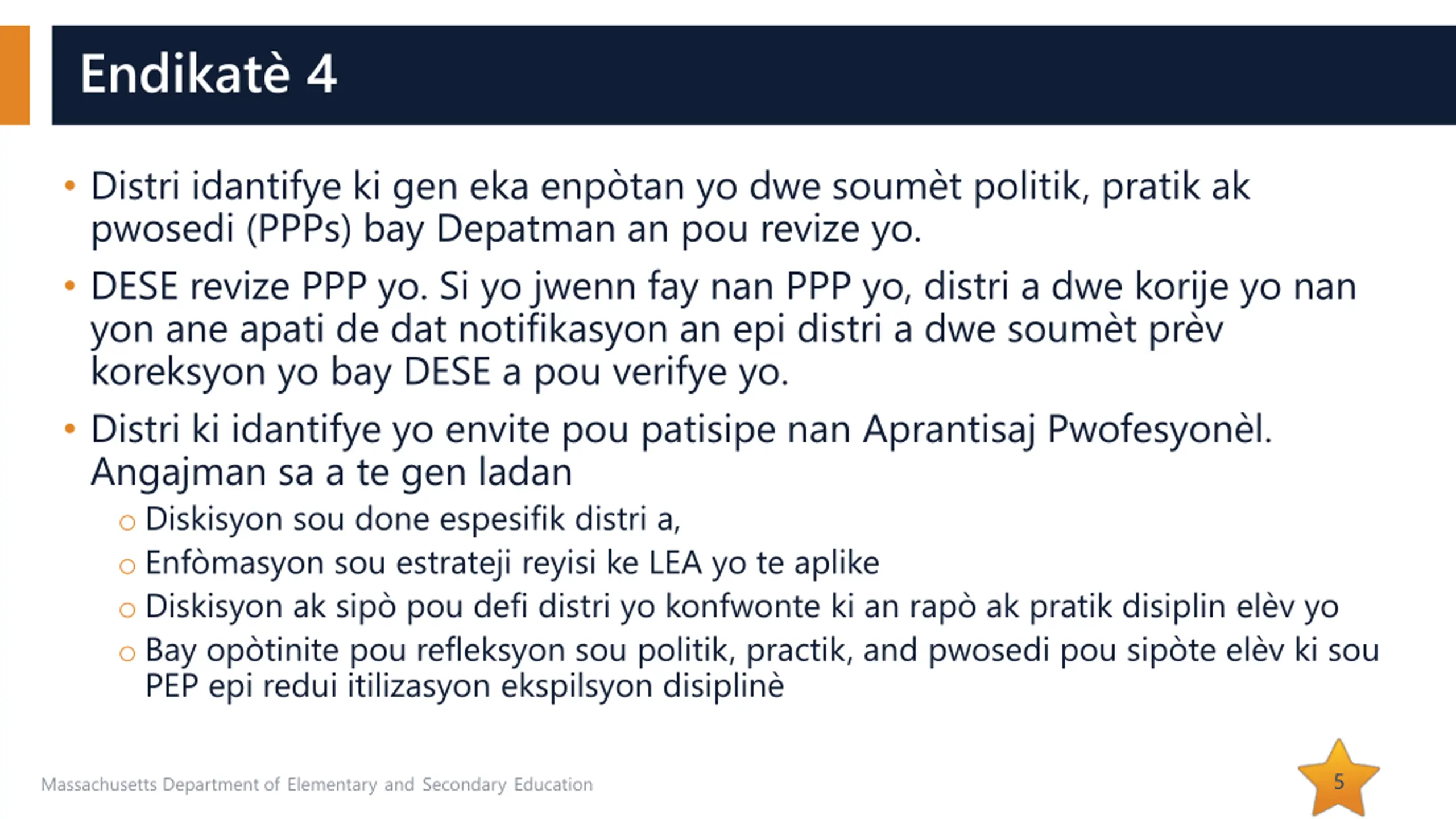 Endikat 4 Distri idantifye ki gen eka enp tan yo dwe soum t politik, pratik ak pwosedi (PPPs) bay Depatman an pou revize yo. DESE revize PPP yo. Si yo jwenn fay nan PPP yo, distri a dwe korije yo nan yon ane apati de dat notifikasyon an epi distri a dwe soum t pr v koreksyon yo bay DESE a pou verifye yo. Distri ki idantifye yo envite pou patisipe nan Aprantisaj Pwofesyon l. Angajman sa a te gen ladan o Diskisyon sou done espesifik distri a, o Enf masyon sou estrateji reyisi ke LEA yo te aplike o Diskisyon ak sip pou defi distri yo konfwonte ki an rap ak pratik disiplin el v yo o Bay op tinite pou refleksyon sou politik, practik, and pwosedi pou sip te el v ki sou PEP epi redui itilizasyon ekspilsyon disiplin Massachusetts Department ofElementaryandSecondaryEducation 5