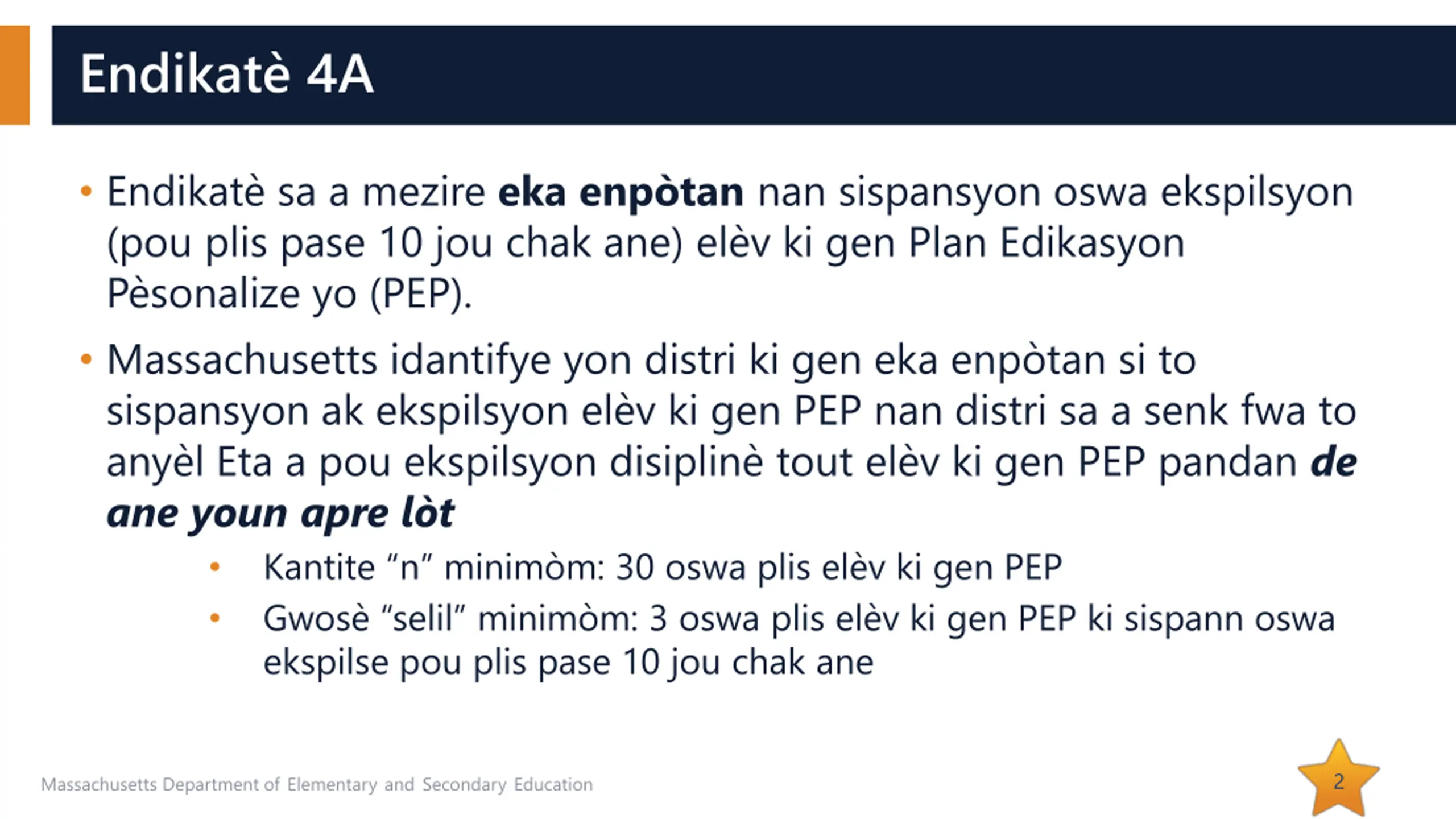 Endikat 4A Endikat sa a mezire eka enp tan nan sispansyon oswa ekspilsyon (pou plis pase 10 jou chak ane) el v ki gen Plan Edikasyon P sonalize yo (PEP). Massachusetts idantifye yon distri ki gen eka enp tan si to sispansyon ak ekspilsyon el v ki gen PEP nan distri sa a senk fwa to any l Eta a pou ekspilsyon disiplin tout el v ki gen PEP pandan de ane youn apre l t Kantite n minim m: 30 oswa plis el v ki gen PEP Gwos selil minim m: 3 oswa plis el v ki gen PEP ki sispann oswa ekspilse pou plis pase 10 jou chak ane 2 Massachusetts Department of Elementary and Secondary Education