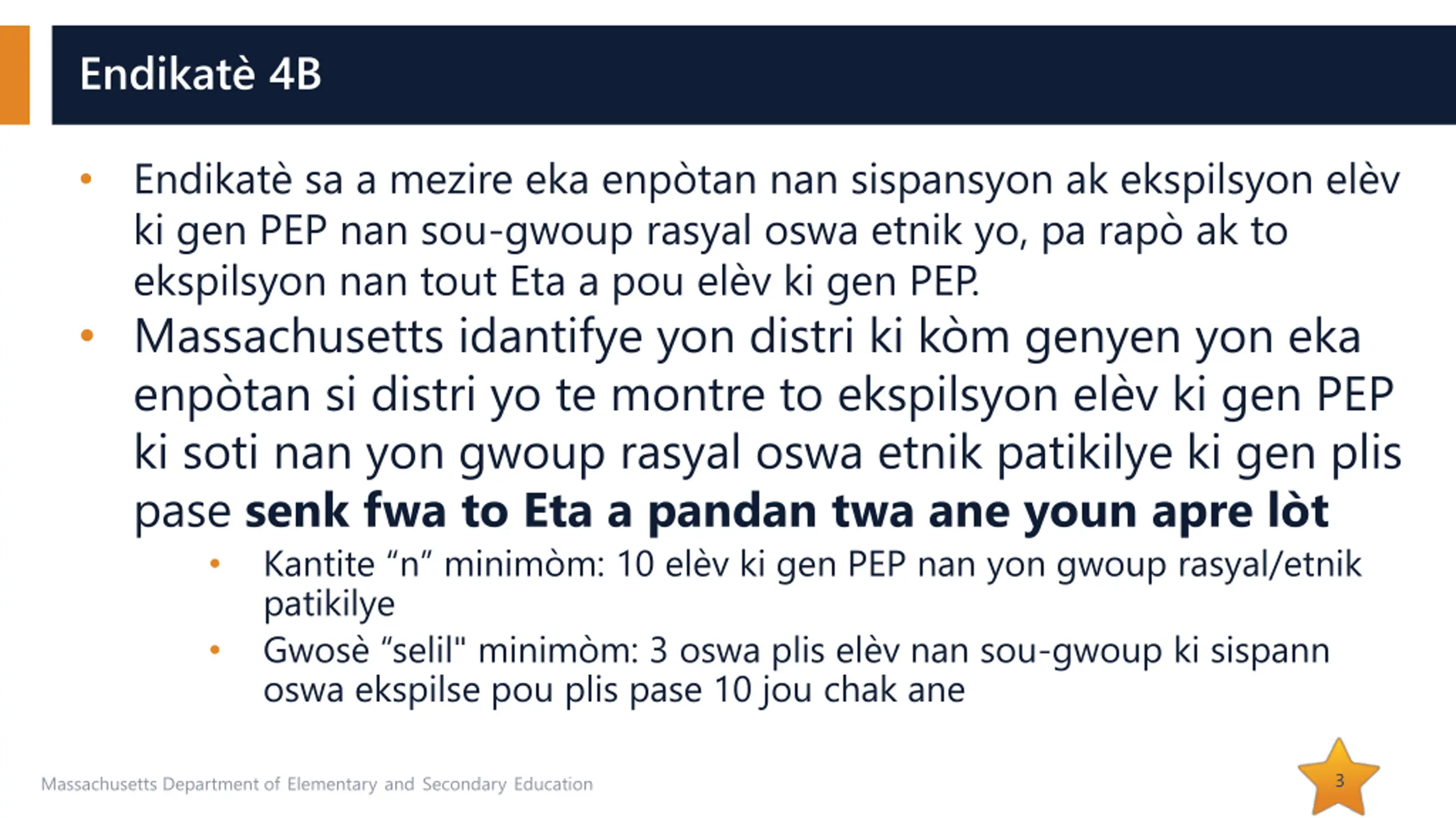 Endikat 4B Endikat sa a mezire eka enp tan nan sispansyon ak ekspilsyon el v ki gen PEP nan sou-gwoup rasyal oswa etnik yo, pa rap ak to ekspilsyon nan tout Eta a pou el v ki gen PEP. Massachusetts idantifye yon distri ki k m genyen yon eka enp tan si distri yo te montre to ekspilsyon el v ki gen PEP ki soti nan yon gwoup rasyal oswa etnik patikilye ki gen plis pase senk fwa to Eta a pandan twa ane youn apre l t Kantite n minim m: 10 el v ki gen PEP nan yon gwoup rasyal/etnik patikilye Gwos selil" minim m: 3 oswa plis el v nan sou-gwoup ki sispann oswa ekspilse pou plis pase 10 jou chak ane Massachusetts Department ofElementaryandSecondaryEducation 3