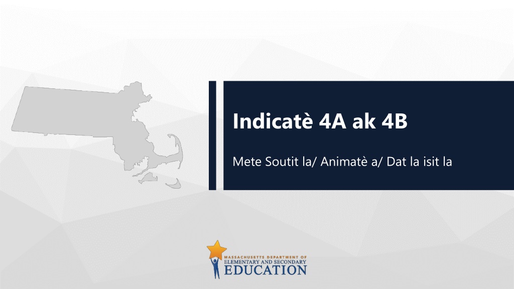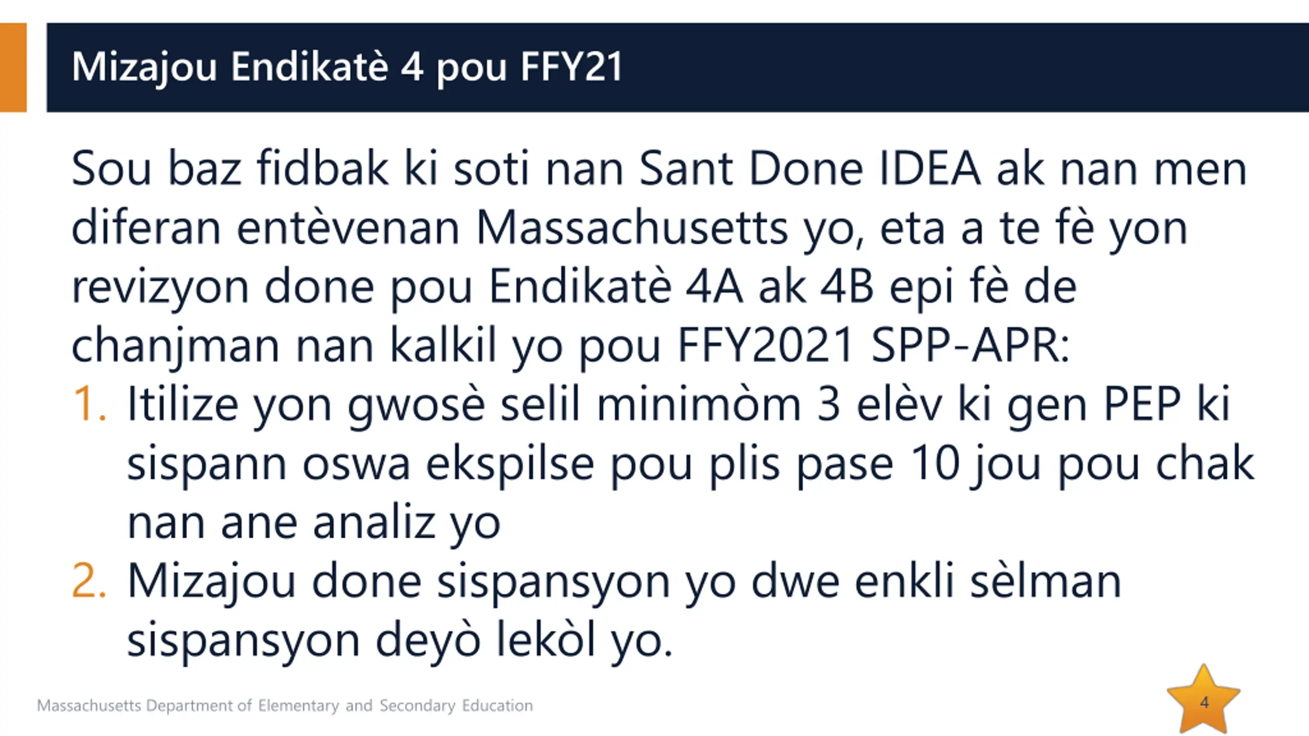 Mizajou Endikat 4 pou FFY21 Sou baz fidbak ki soti nan Sant Done IDEA ak nan men diferan ent venan Massachusetts yo, eta a te f yon revizyon done pou Endikat 4A ak 4B epi f de chanjman nan kalkil yo pou FFY2021 SPP-APR: 1. Itilize yon gwos selil minim m 3 el v ki gen PEP ki sispann oswa ekspilse pou plis pase 10 jou pou chak nan ane analiz yo 2. Mizajou done sispansyon yo dwe enkli s lman sispansyon dey lek l yo. Massachusetts Department ofElementaryandSecondaryEducation 4