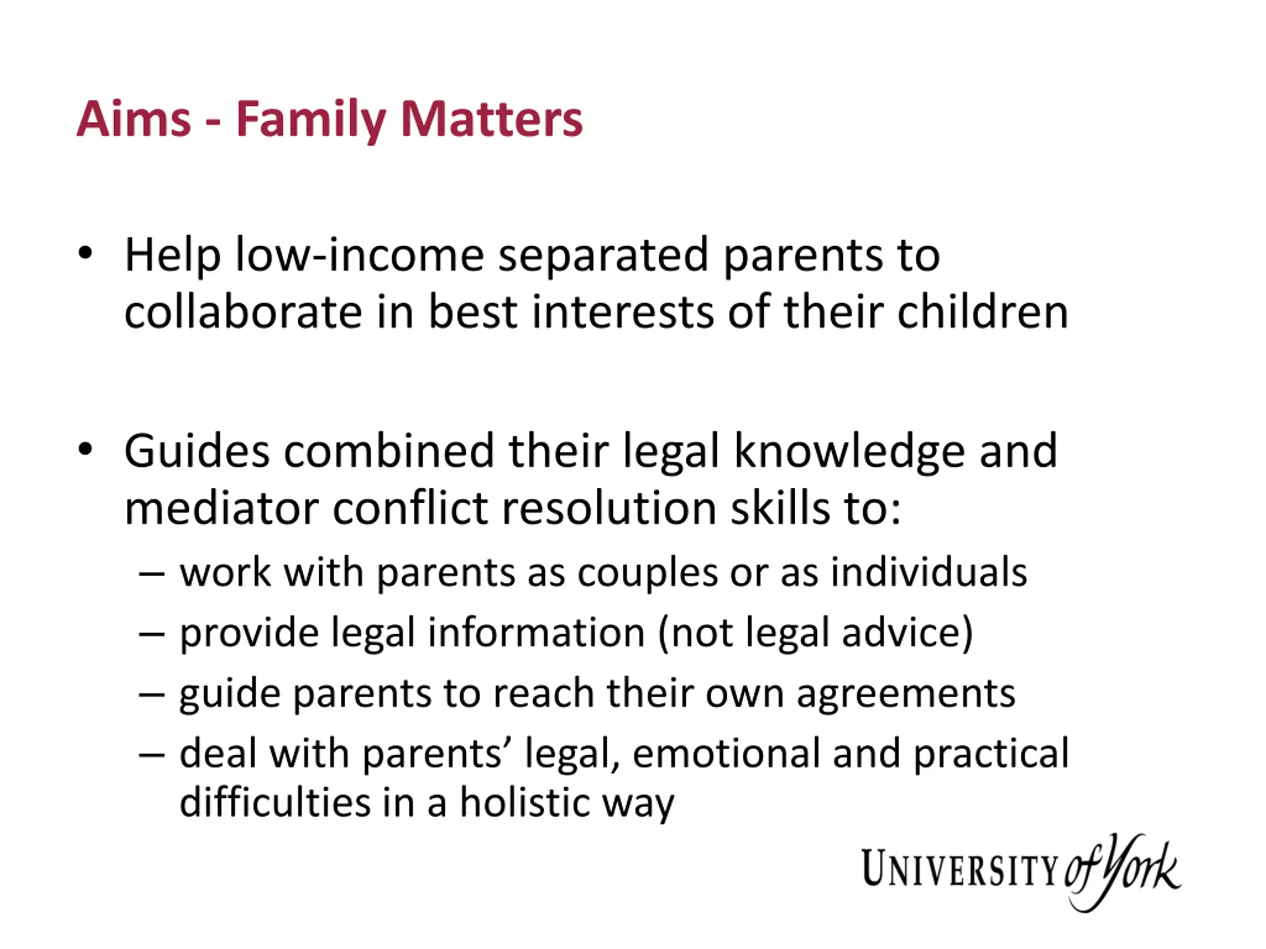 Aims - Family Matters Help low-income separated parents to collaborate in best interests of their children Guides combined their legal knowledge and mediator conflict resolution skills to: work with parents as couples or as individuals provide legal information (not legal advice) guide parents to reach their own agreements deal with parents legal, emotional and practical difficulties in a holistic way