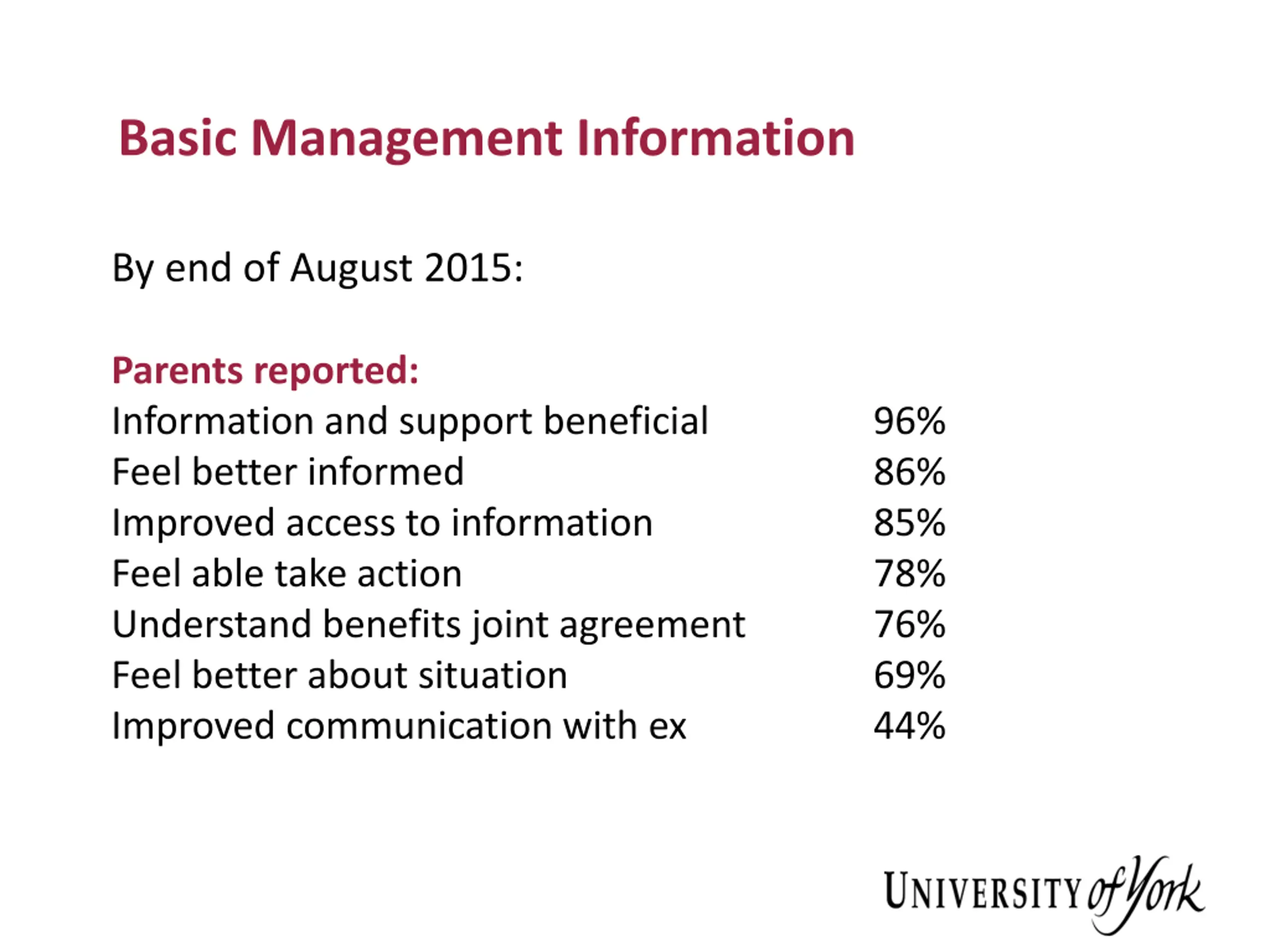 Basic Management Information By end of August 2015: Parents reported: Information and support beneficial Feel better informed Improved access to information Feel able take action Understand benefits joint agreement Feel better about situation Improved communication with ex 96% 86% 85% 78% 76% 69% 44%