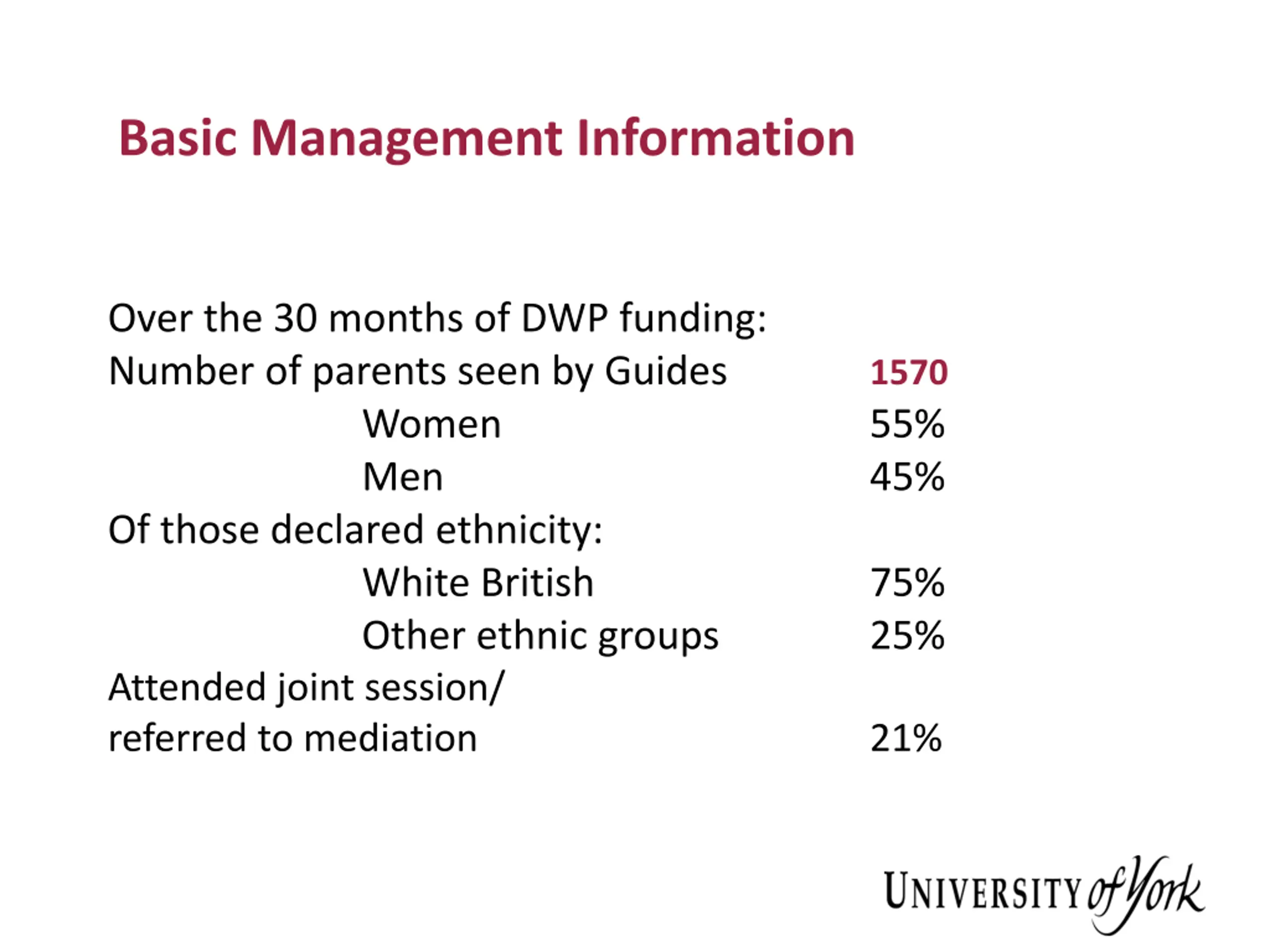 Basic Management Information Over the 30 months of DWP funding: Number of parents seen by Guides Women Men Of those declared ethnicity: White British Other ethnic groups Attended joint session/ referred to mediation 1570 55% 45% 75% 25% 21%