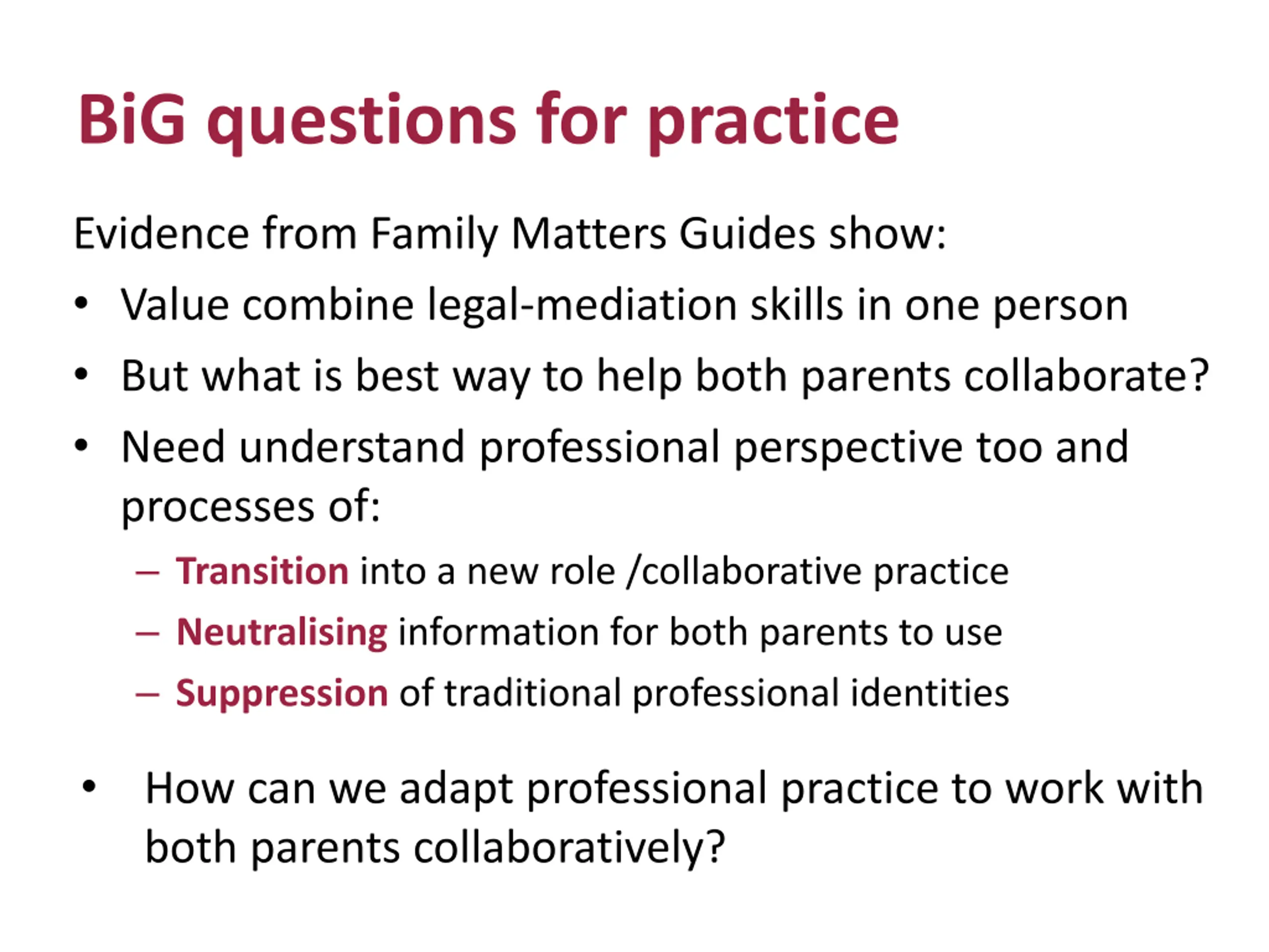 BiG questions for practice Evidence from Family Matters Guides show: Value combine legal-mediation skills in one person But what is best way to help both parents collaborate? Need understand professional perspective too and processes of: Transition into a new role /collaborative practice Neutralising information for both parents to use Suppression of traditional professional identities How can we adapt professional practice to work with both parents collaboratively?