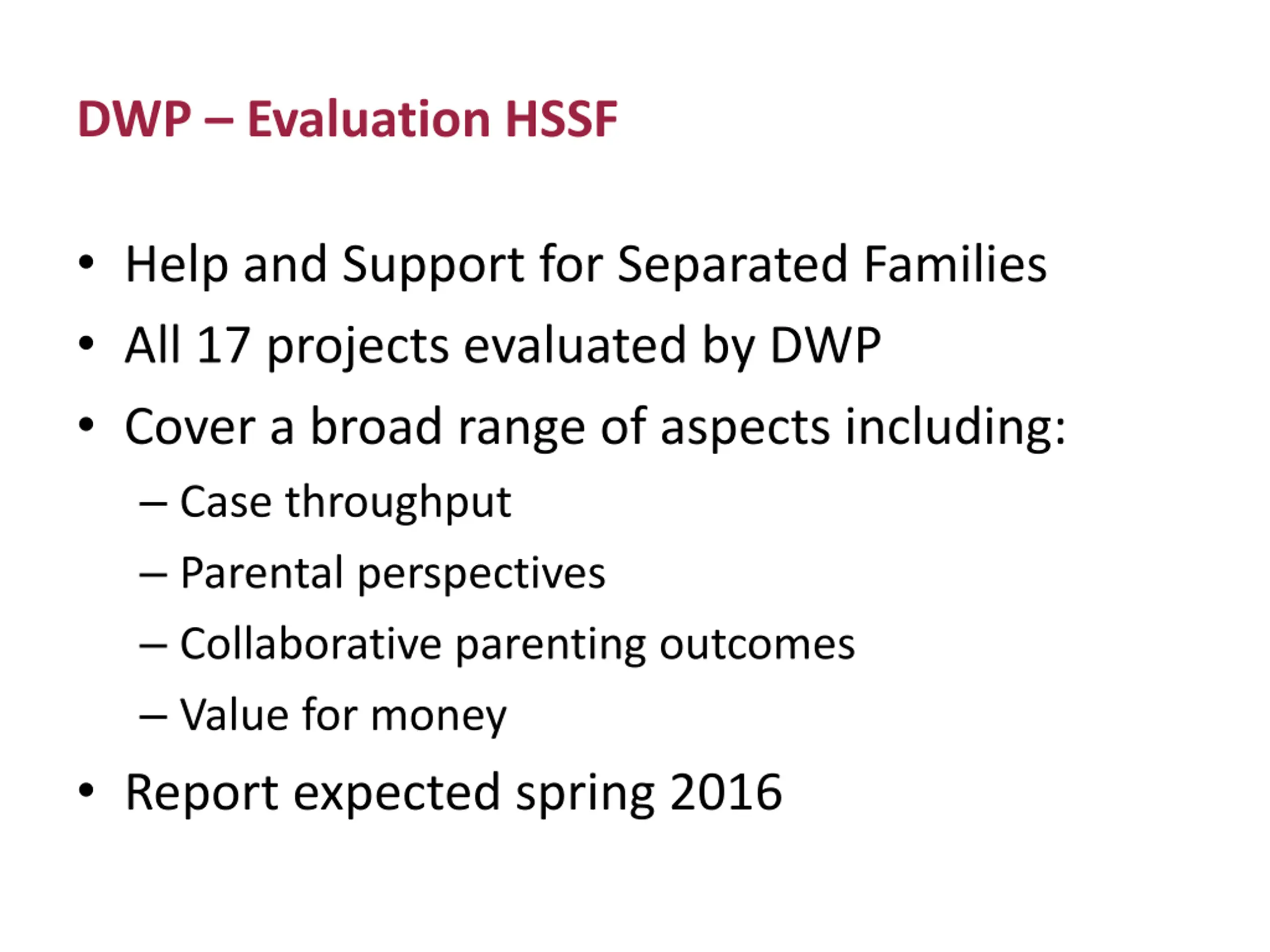 DWP Evaluation HSSF Help and Support for Separated Families All 17 projects evaluated by DWP Cover a broad range of aspects including: Case throughput Parental perspectives Collaborative parenting outcomes Value for money Report expected spring 2016