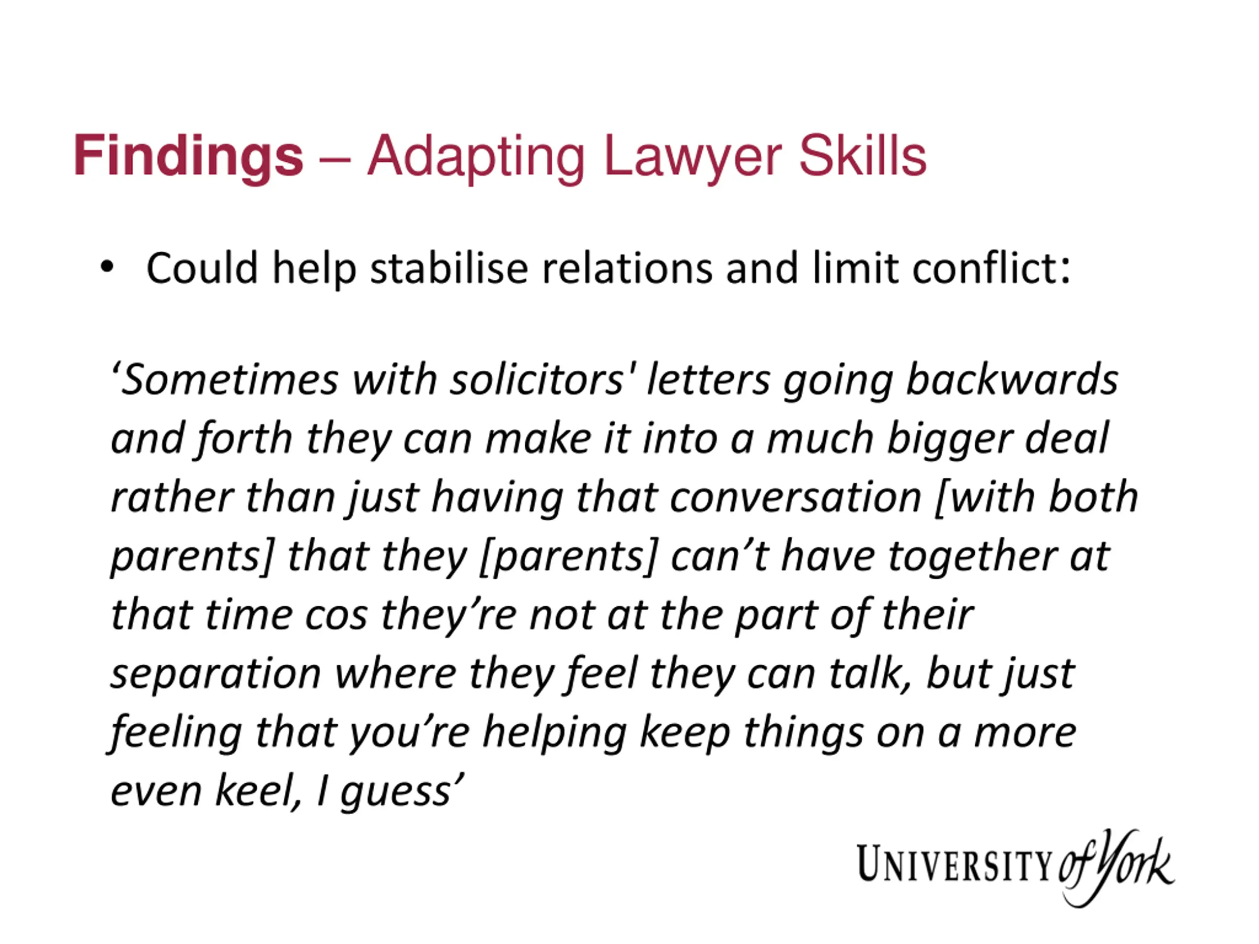 Findings Adapting Lawyer Skills Could help stabilise relations and limit conflict: Sometimes with solicitors' letters going backwards and forth they can make it into a much bigger deal rather than just having that conversation [with both parents] that they [parents] can t have together at that time cos they re not at the part of their separation where they feel they can talk, but just feeling that you re helping keep things on a more even keel, I guess