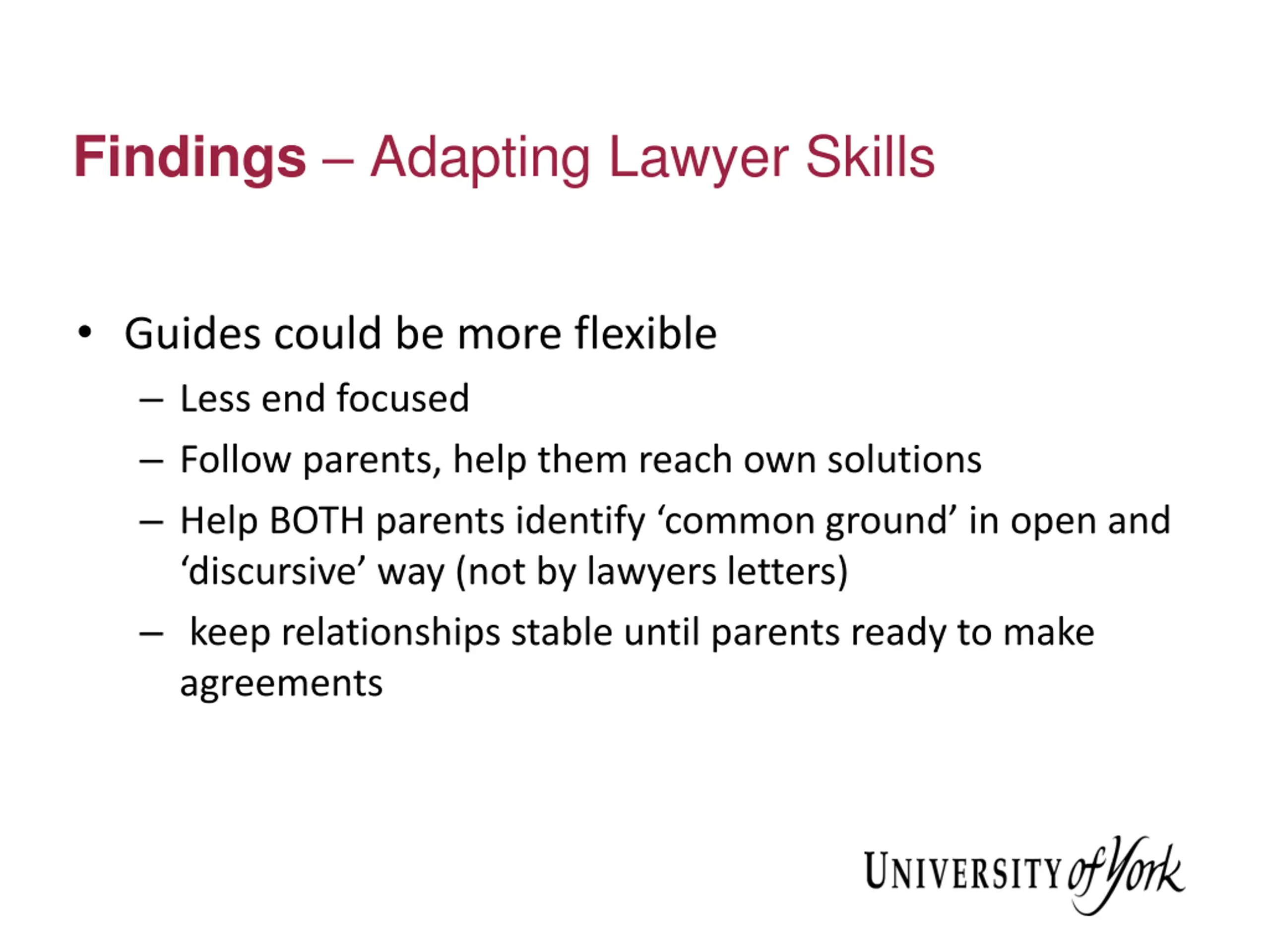 Findings Adapting Lawyer Skills Guides could be more flexible Less end focused Follow parents, help them reach own solutions Help BOTH parents identify common ground in open and discursive way (not by lawyers letters) keep relationships stable until parents ready to make agreements