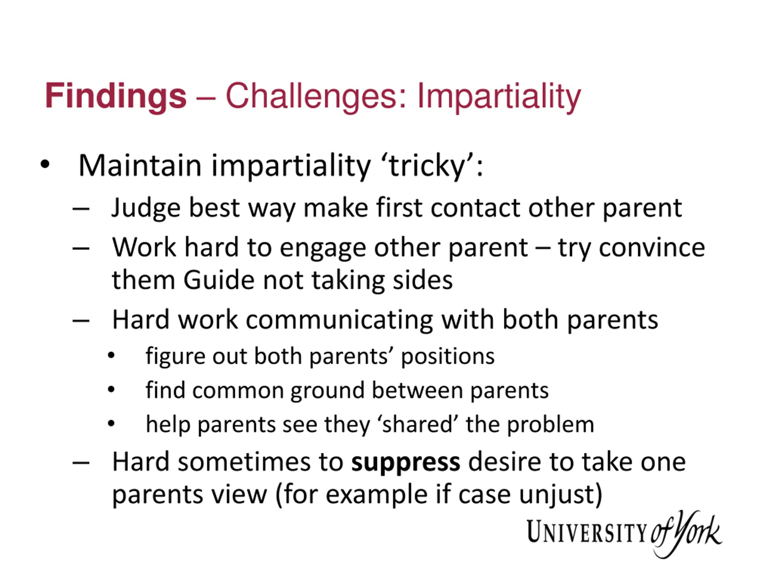 Findings Challenges: Impartiality Maintain impartiality tricky : Judge best way make first contact other parent Work hard to engage other parent try convince them Guide not taking sides Hard work communicating with both parents figure out both parents positions find common ground between parents help parents see they shared the problem Hard sometimes to suppress desire to take one parents view (for example if case unjust)