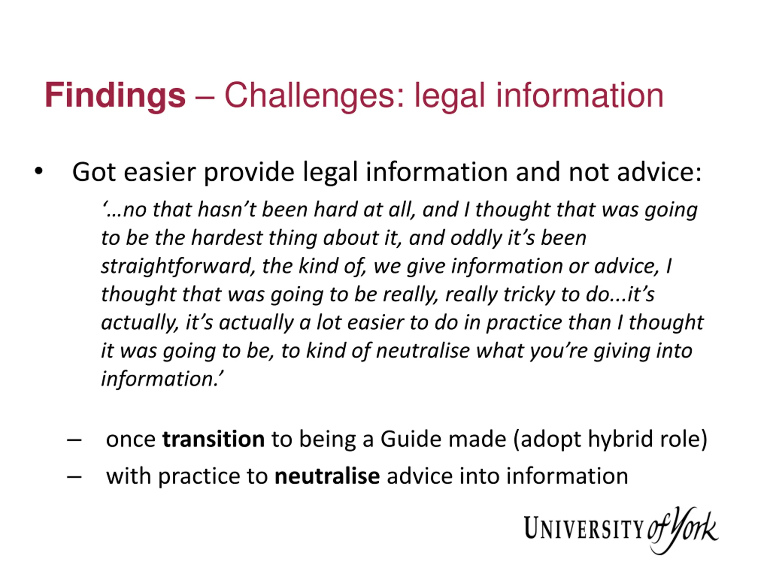 Findings Challenges: legal information Got easier provide legal information and not advice: no that hasn t been hard at all, and I thought that was going to be the hardest thing about it, and oddly it s been straightforward, the kind of, we give information or advice, I thought that was going to be really, really tricky to do...it s actually, it s actually a lot easier to do in practice than I thought it was going to be, to kind of neutralise what you re giving into information. once transition to being a Guide made (adopt hybrid role) with practice to neutralise advice into information