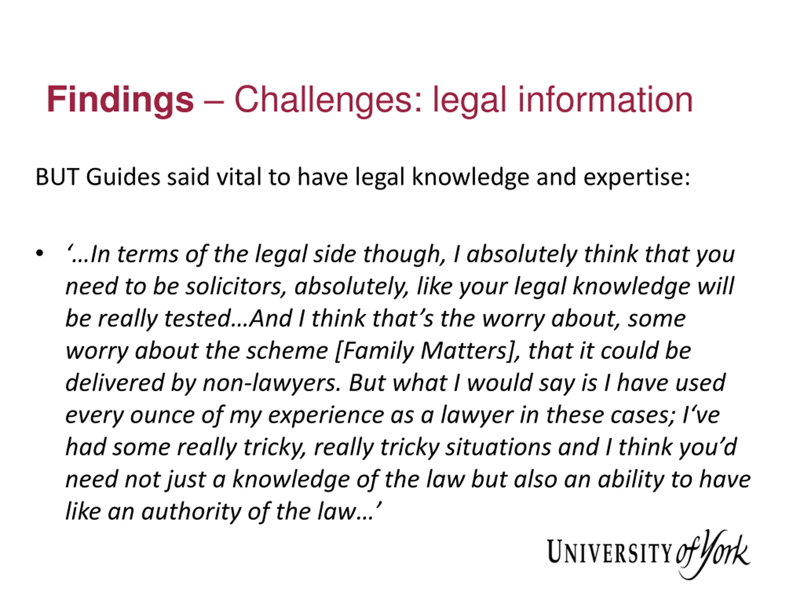 Findings Challenges: legal information BUT Guides said vital to have legal knowledge and expertise: In terms of the legal side though, I absolutely think that you need to be solicitors, absolutely, like your legal knowledge will be really tested And I think that s the worry about, some worry about the scheme [Family Matters], that it could be delivered by non-lawyers. But what I would say is I have used every ounce of my experience as a lawyer in these cases; I ve had some really tricky, really tricky situations and I think you d need not just a knowledge of the law but also an ability to have like an authority of the law