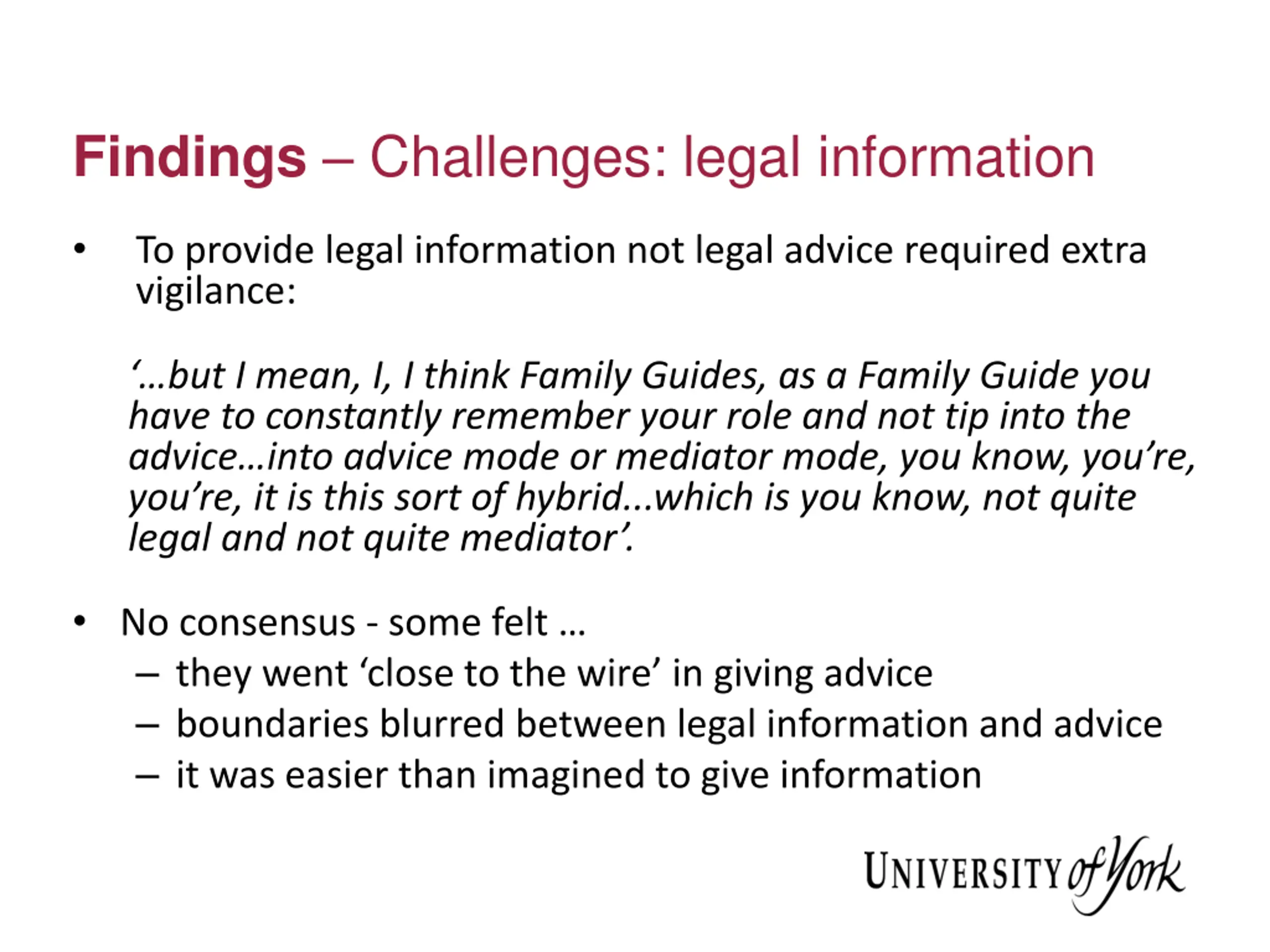 Findings Challenges: legal information To provide legal information not legal advice required extra vigilance: but I mean, I, I think Family Guides, as a Family Guide you have to constantly remember your role and not tip into the advice into advice mode or mediator mode, you know, you re, you re, it is this sort of hybrid...which is you know, not quite legal and not quite mediator . No consensus - some felt they went close to the wire in giving advice boundaries blurred between legal information and advice it was easier than imagined to give information