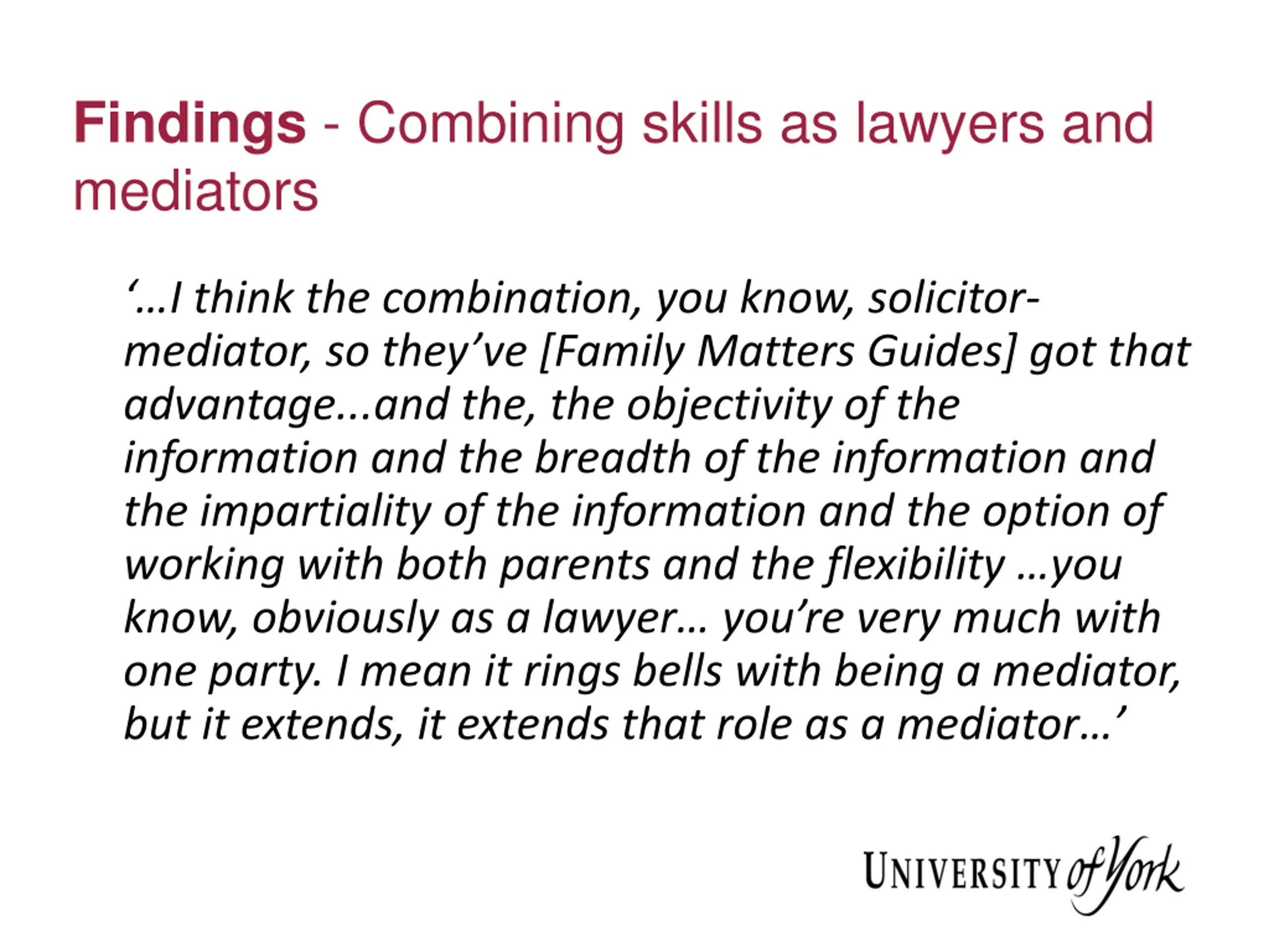 Findings - Combining skills as lawyers and mediators I think the combination, you know, solicitor- mediator, so they ve [Family Matters Guides] got that advantage...and the, the objectivity of the information and the breadth of the information and the impartiality of the information and the option of working with both parents and the flexibility you know, obviously as a lawyer you re very much with one party. I mean it rings bells with being a mediator, but it extends, it extends that role as a mediator