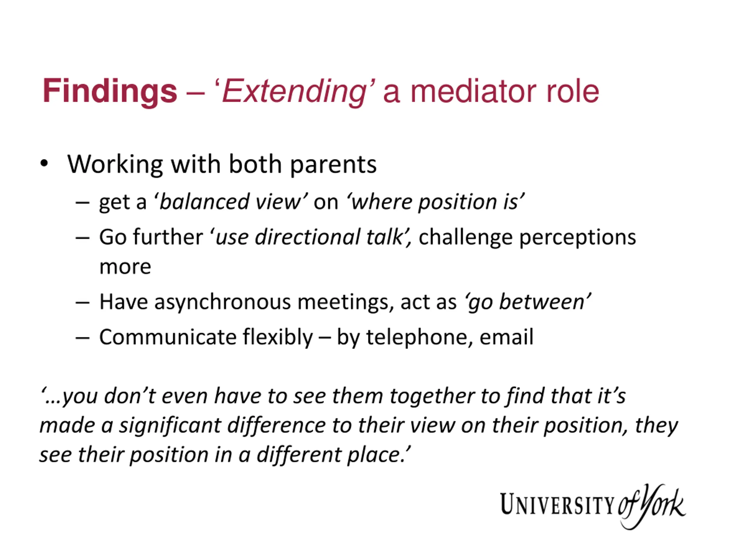 Findings Extending a mediator role Working with both parents get a balanced view on where position is Go further use directional talk , challenge perceptions more Have asynchronous meetings, act as go between Communicate flexibly by telephone, email you don t even have to see them together to find that it s made a significant difference to their view on their position, they see their position in a different place.
