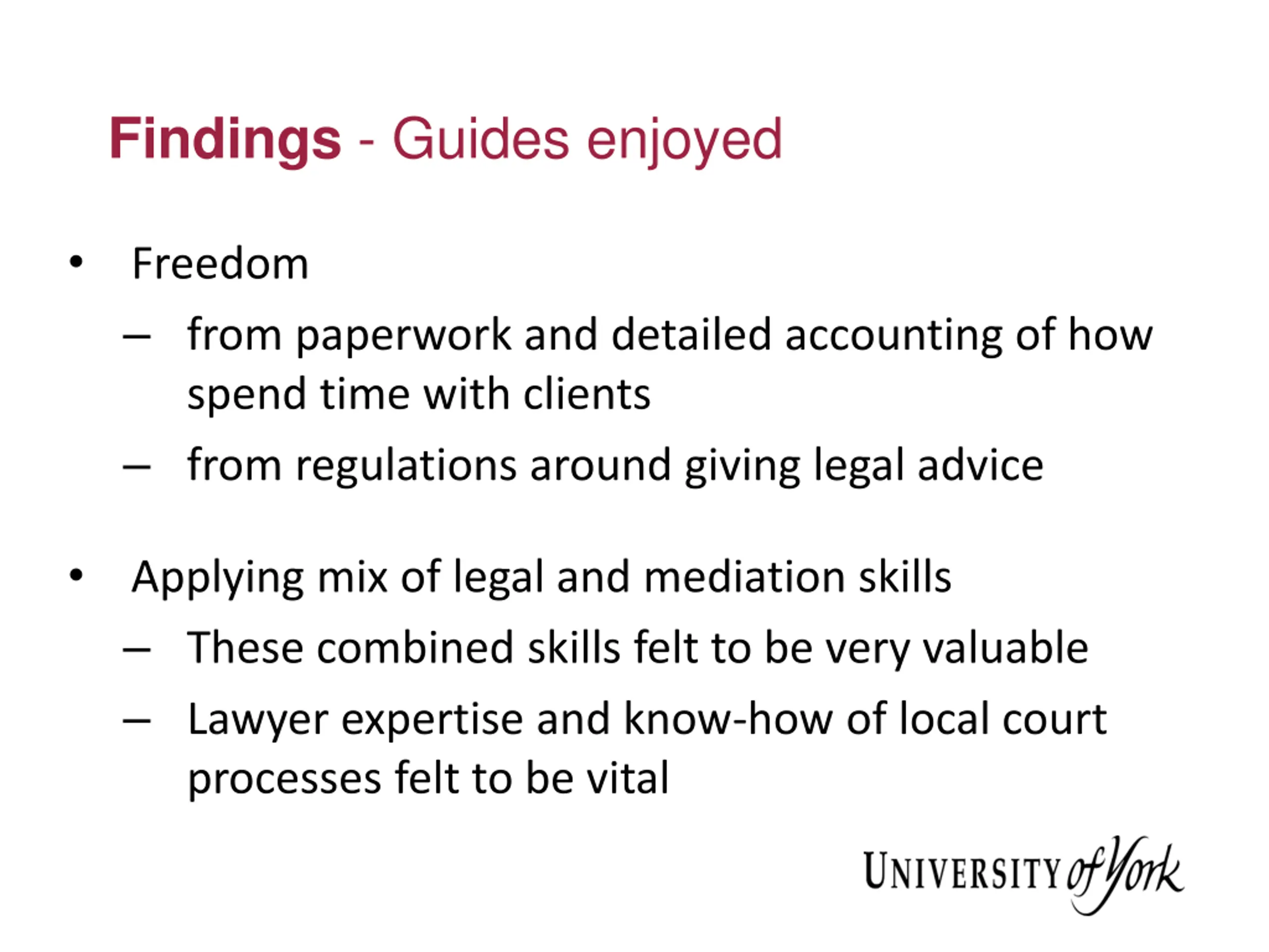 Findings - Guides enjoyed Freedom from paperwork and detailed accounting of how spend time with clients from regulations around giving legal advice Applying mix of legal and mediation skills These combined skills felt to be very valuable Lawyer expertise and know-how of local court processes felt to be vital