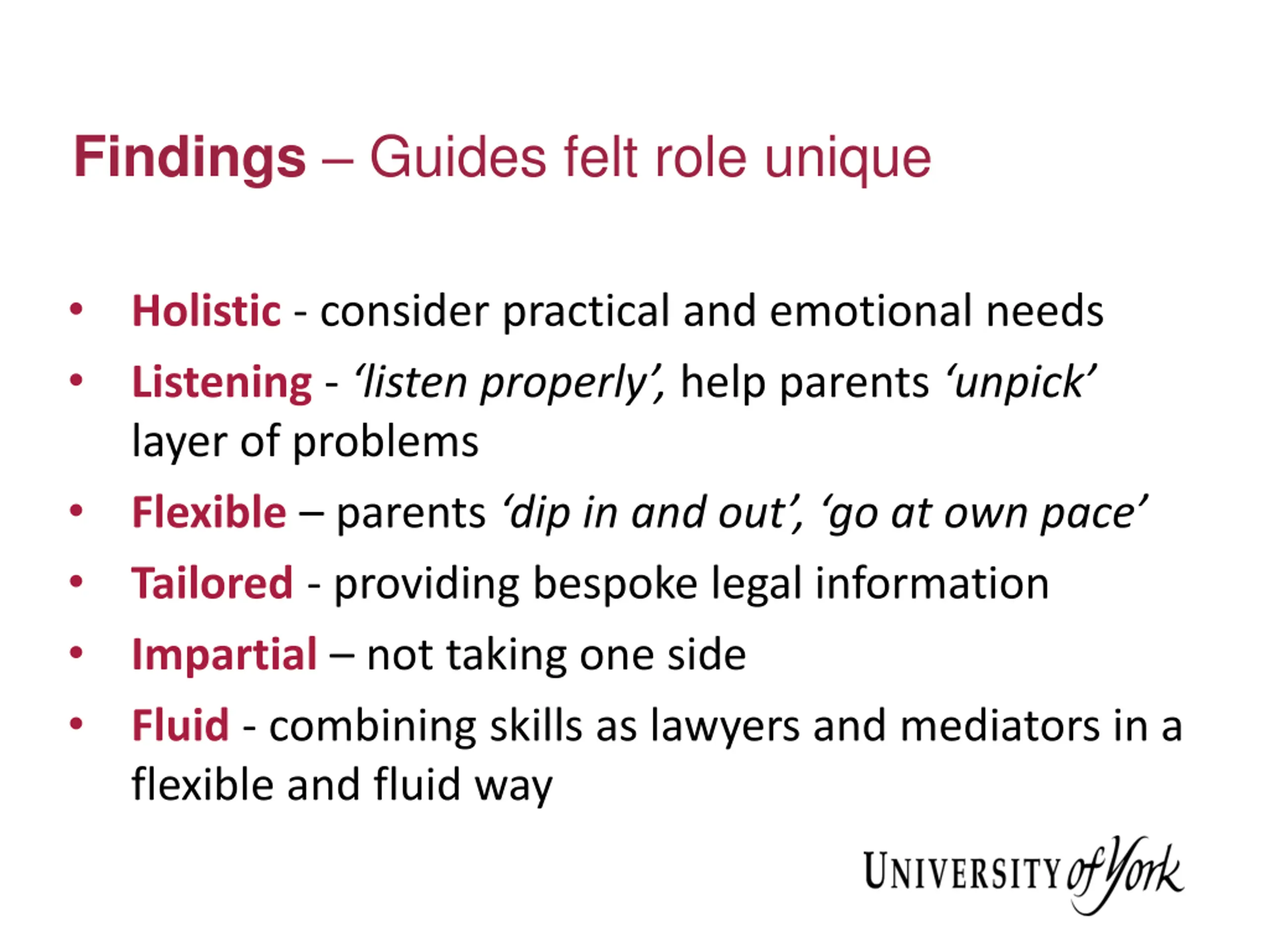 Findings Guides felt role unique Holistic - consider practical and emotional needs Listening - listen properly , helpparents unpick layer of problems Flexible parents dip in and out , go at own pace Tailored - providing bespoke legal information Impartial not taking one side Fluid - combining skills as lawyers and mediators in a flexible and fluid way