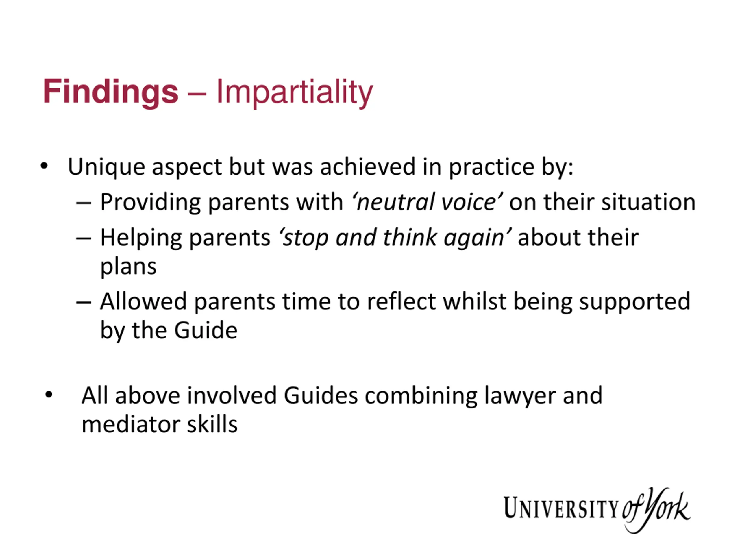Findings Impartiality Unique aspect but was achieved in practice by: Providing parents with neutral voice on their situation Helping parents stop and think again about their plans Allowed parents time to reflect whilst being supported by the Guide All above involved Guides combining lawyer and mediator skills