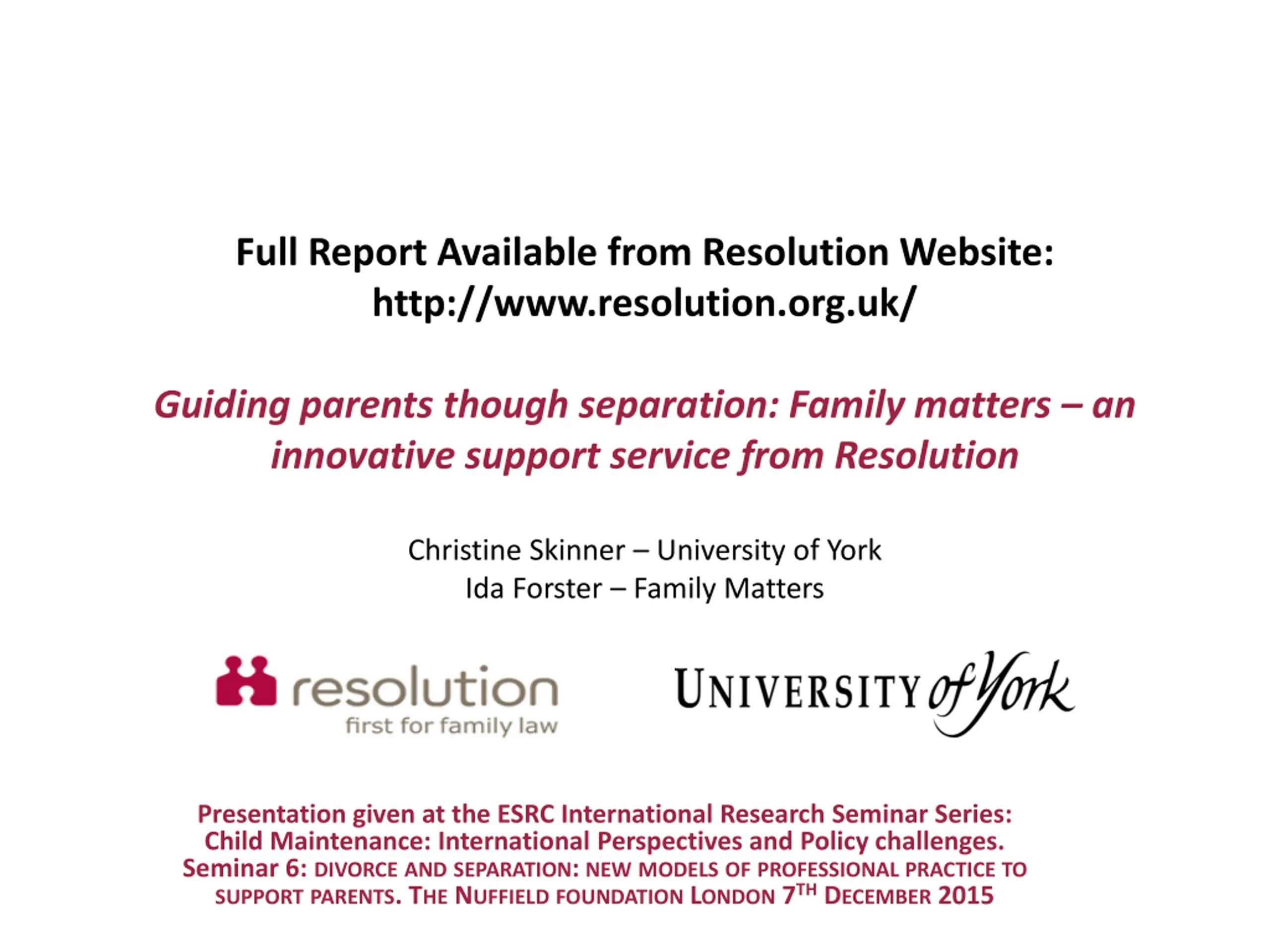 Full Report Available from Resolution Website: http://www.resolution.org.uk/ Guiding parents though separation: Family matters an innovative support service from Resolution Christine Skinner University of York Ida Forster Family Matters Presentation given at the ESRC International Research Seminar Series: Child Maintenance: International Perspectives and Policy challenges. Seminar 6: DIVORCEANDSEPARATION: NEWMODELSOFPROFESSIONALPRACTICETO SUPPORTPARENTS. THE NUFFIELDFOUNDATION LONDON 7TH DECEMBER 2015