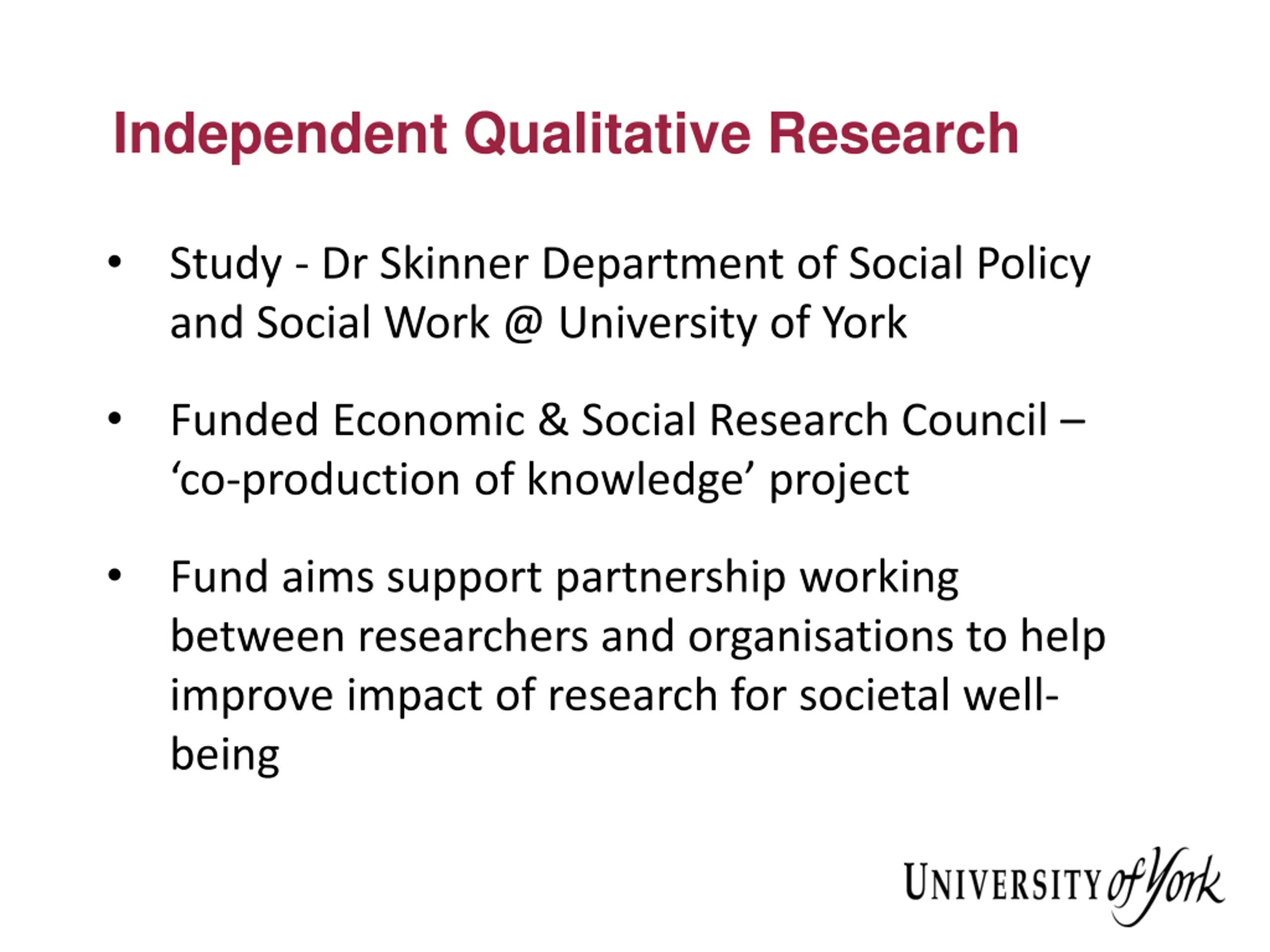 Independent Qualitative Research Study - Dr Skinner Department of Social Policy and Social Work @ University of York Funded Economic & Social Research Council co-production of knowledge project Fund aims support partnership working between researchers and organisations to help improve impact of research for societal well- being
