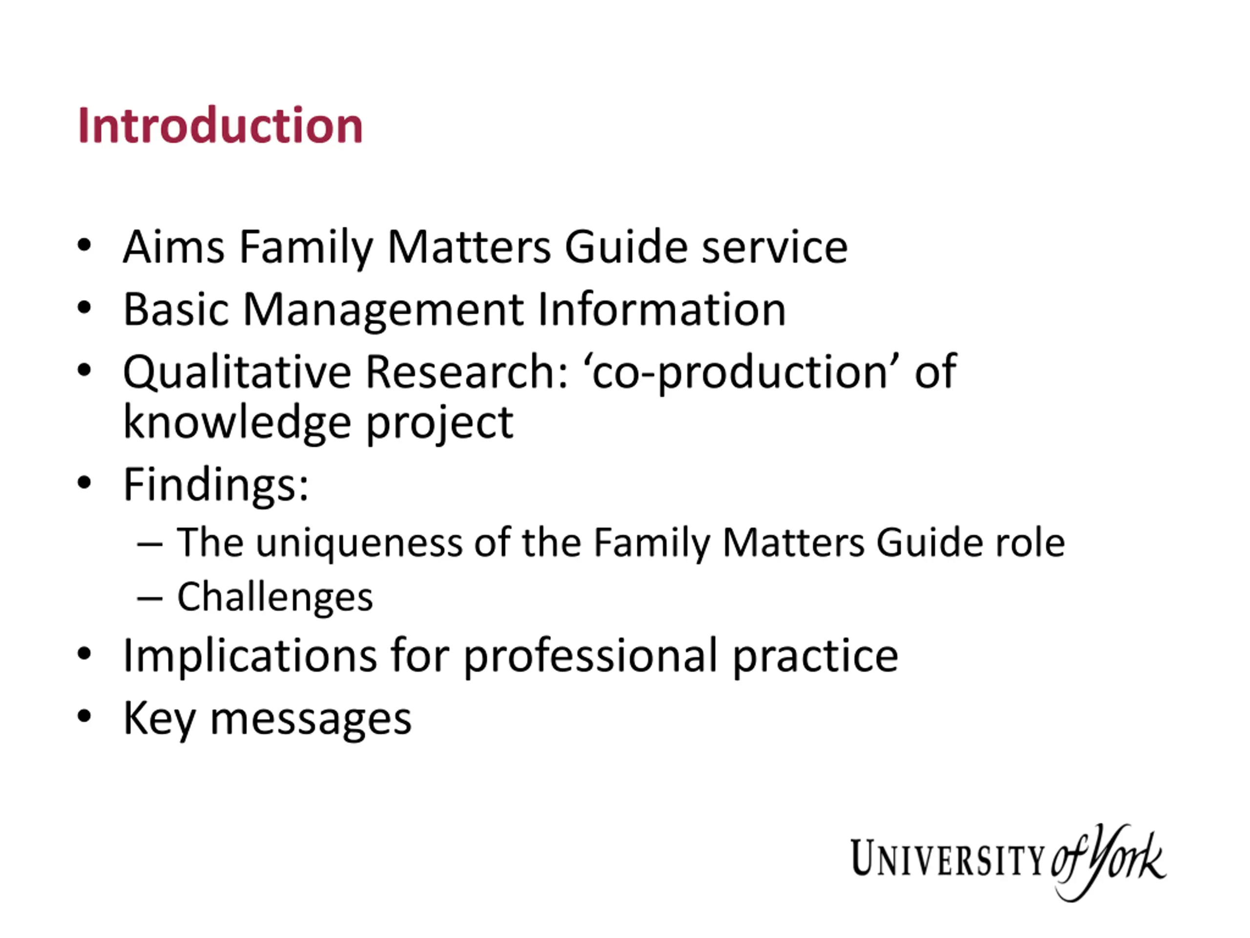 Introduction Aims Family Matters Guide service Basic Management Information Qualitative Research: co-production of knowledge project Findings: The uniqueness of the Family Matters Guide role Challenges Implications for professional practice Key messages