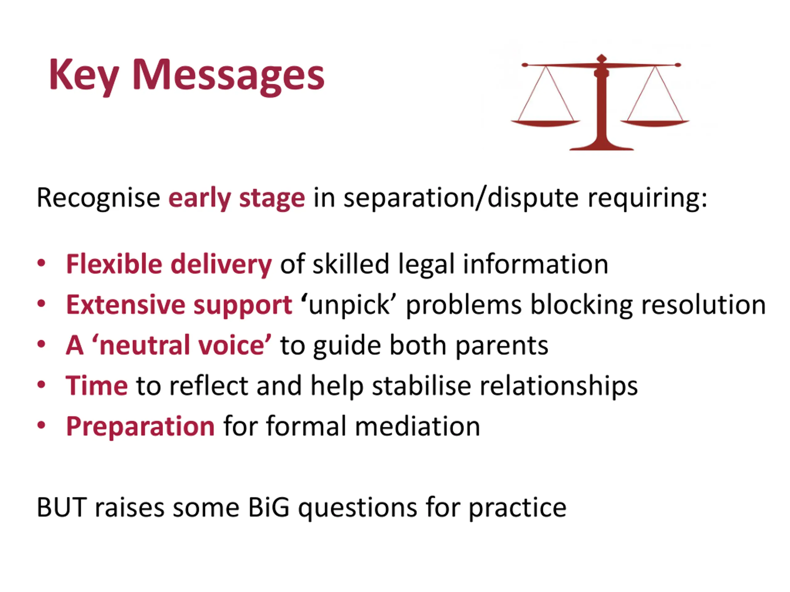 Key Messages Recognise early stage in separation/dispute requiring: Flexible delivery of skilled legal information Extensive support unpick problems blocking resolution A neutral voice to guide both parents Time to reflect and help stabilise relationships Preparation for formal mediation BUT raises some BiG questions for practice