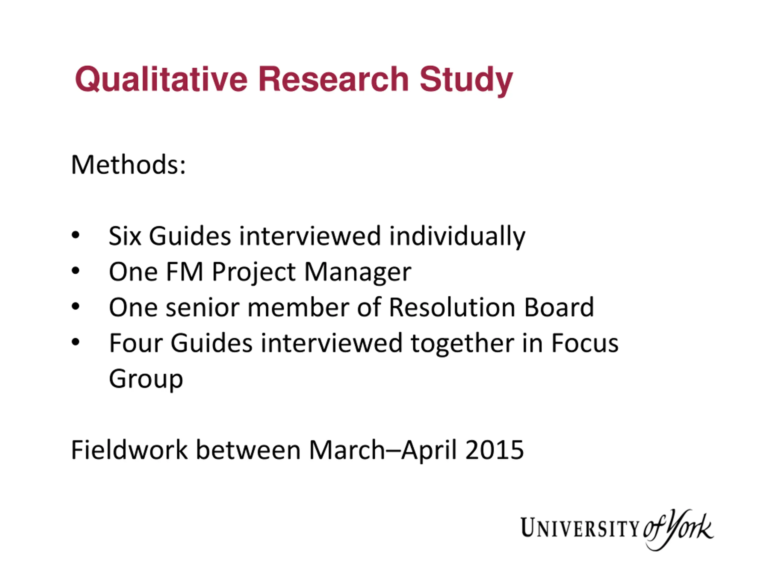Qualitative Research Study Methods: Six Guides interviewed individually One FM Project Manager One senior member of Resolution Board Four Guides interviewed together in Focus Group Fieldwork between March April 2015