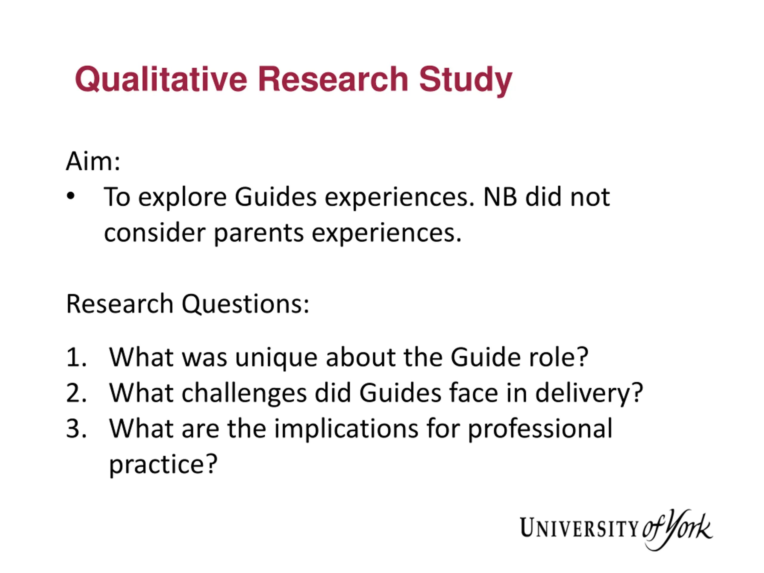 Qualitative Research Study Aim: To explore Guides experiences. NB did not consider parents experiences. Research Questions: 1. What was unique about the Guide role? 2. What challenges did Guides face in delivery? 3. What are the implications for professional practice?