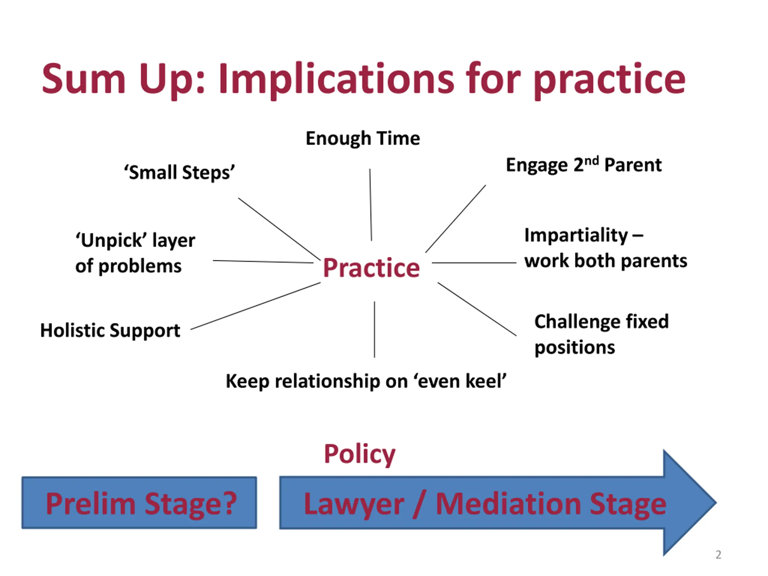Sum Up: Implications for practice Enough Time Engage 2nd Parent Small Steps Impartiality work both parents Unpick layer of problems Practice Challenge fixed positions Holistic Support Keep relationship on even keel Policy Prelim Stage? Lawyer / Mediation Stage 2
