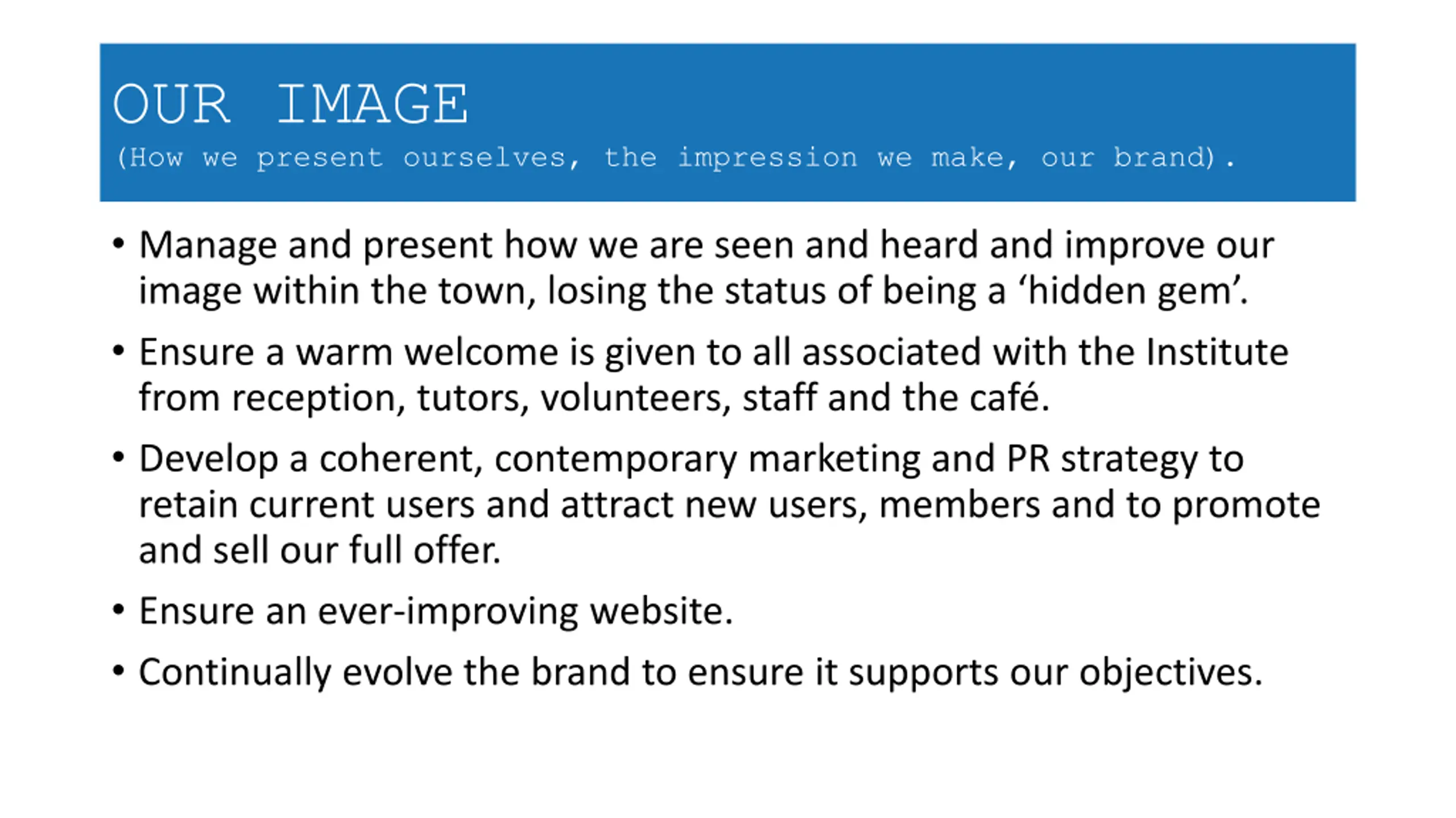 OUR IMAGE (How we present ourselves, the impression we make, our brand). Manage and present how we are seen and heard and improve our image within the town, losing the status of being a hidden gem . Ensure a warm welcome is given to all associated with the Institute from reception, tutors, volunteers, staff and the caf . Develop a coherent, contemporary marketing and PR strategy to retain current users and attract new users, members and to promote and sell our full offer. Ensure an ever-improving website. Continually evolve the brand to ensure it supports our objectives.