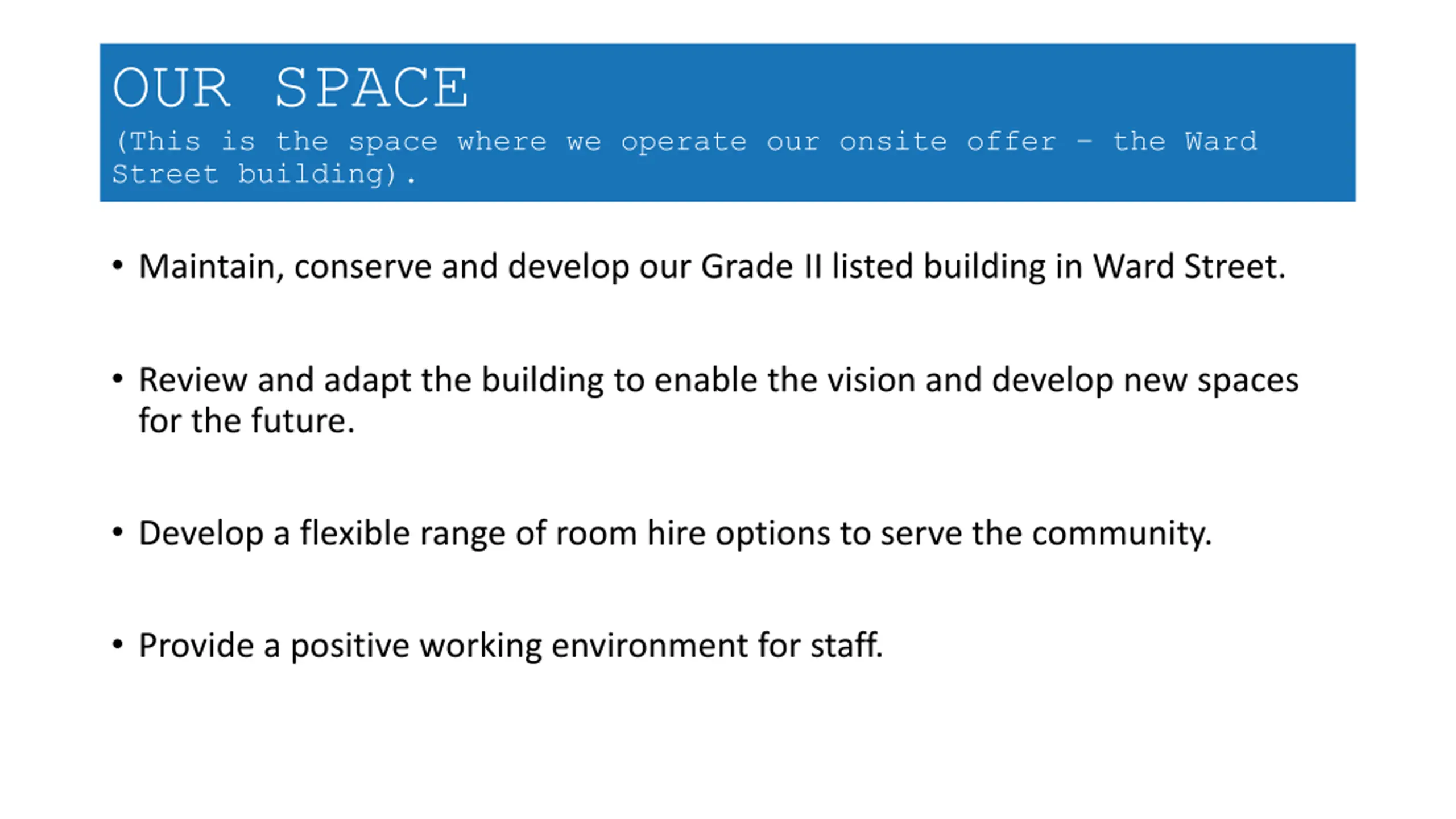 OUR SPACE (This is the space where we operate our onsite offer the Ward Street building). Maintain, conserve and develop our Grade II listed building in Ward Street. Review and adapt the building to enable the vision and develop new spaces for the future. Develop a flexible range of room hire options to serve the community. Provide a positive working environment for staff.