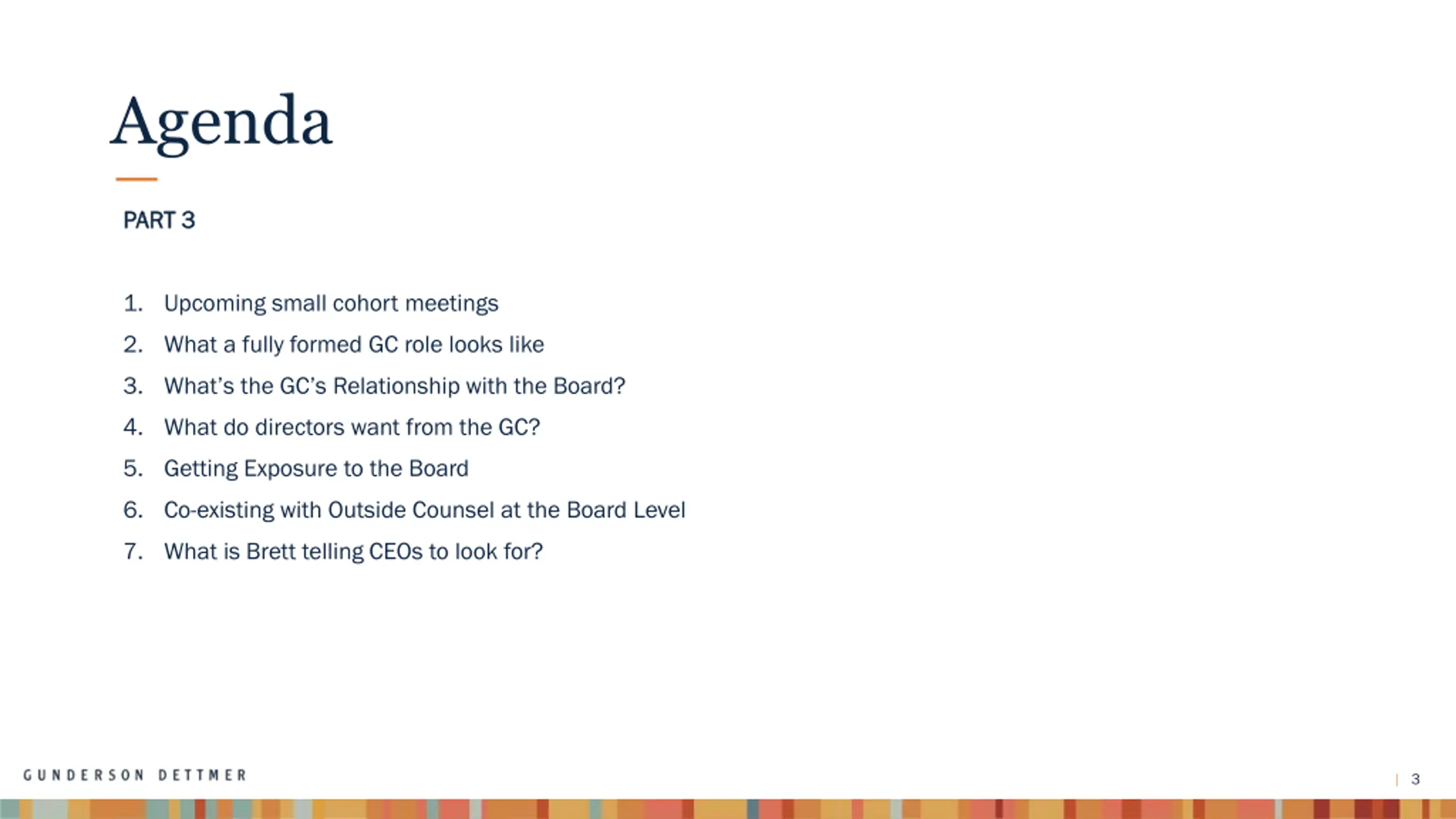 Agenda PART 3 PART 3 1. Upcoming small cohort meetings 2. What a fully formed GC role looks like 3. What s the GC s Relationship with the Board? 4. What do directors want from the GC? 5. Getting Exposure to the Board 6. Co-existing with Outside Counsel at the Board Level 7. What is Brett telling CEOs to look for? 3