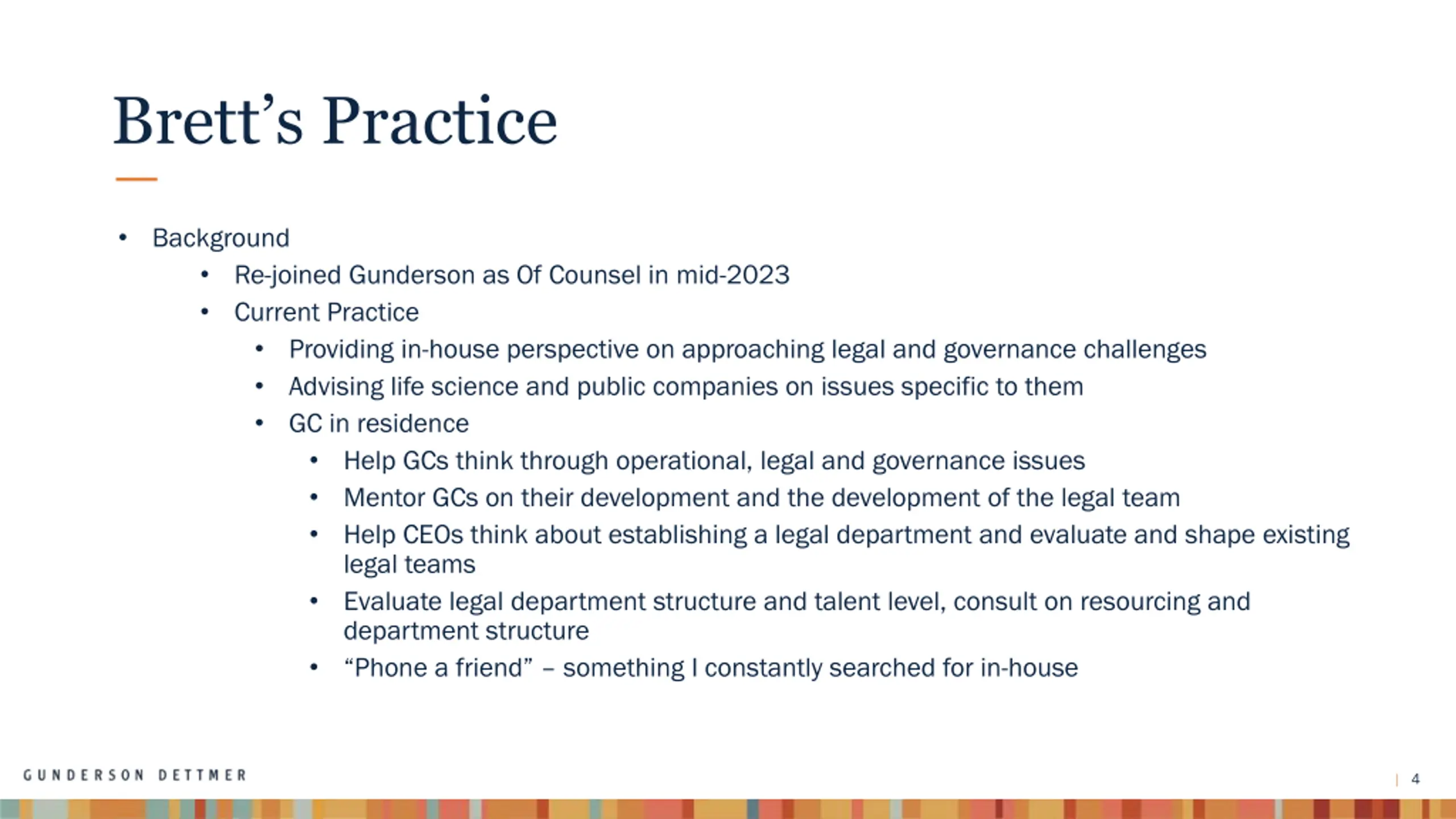 Bretts Practice Background Re-joined Gunderson as Of Counsel in mid-2023 Current Practice Providing in-house perspective on approaching legal and governance challenges Advising life science and public companies on issues specific to them GC in residence Help GCs think through operational, legal and governance issues Mentor GCs on their development and the development of the legal team Help CEOs think about establishing a legal department and evaluate and shape existing legal teams Evaluate legal department structure and talent level, consult on resourcing and department structure Phone a friend something I constantly searched for in-house 4